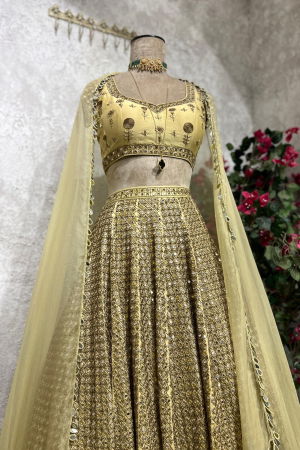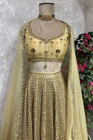 Draped in a spectrum of lime green hues and meticulously hand-stitched, this lehenga epitomizes the fusion of colors and craftsmanship. Each delicate stitch weaves a narrative of skill and commitment, imbuing the ensemble with an irresistible allure. Surrender to the vibrant spirit of this hue as it dances elegantly across the fabric, tantalizing the senses and captivating onlookers with its enchanting charm.