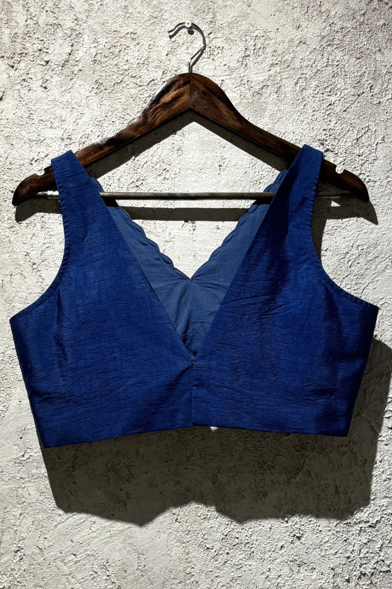 The ink blue and gold combination is inherently luxurious, evoking a sense of royalty and glamour. It's a timeless pairing that transcends trends, making it suitable for various occasions ranging from formal events to festive celebrations. Crafted from rich raw silk, the Neelam Blouse features intricate embroidery concentrated on the bust, adding depth and artistry to its elegant silhouette. The raw silk fabric not only enhances the structure and sheen of the blouse but also ensures a refined drape, making it a perfect choice for those who appreciate classic sophistication with handcrafted detailing.