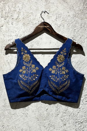 The Neelam Blouse is a masterful blend of elegance and craftsmanship, crafted from premium raw silk that offers a naturally breathable fit, ensuring comfort without compromising on style. Dressed in a rich ink blue hue, this piece exudes timeless sophistication, enhanced by a striking gold accent that adds a regal touch. Each detail is meticulously hand-embroidered, showcasing artisanal precision and adding depth to the fabric's texture. Designed for the modern woman who values both tradition and refinement, this blouse is ideal for a wide range of occasions including weddings, mehandi ceremonies, sangeet events, engagements, receptions, cocktail parties, and bridal trousseau collections. The versatile ink blue and gold color combination effortlessly transitions from formal gatherings to festive celebrations, making it a cherished addition to any wardrobe. Its refined silhouette and luxurious material ensure it stands out as a statement piece, combining heritage craftsmanship with contemporary appeal.