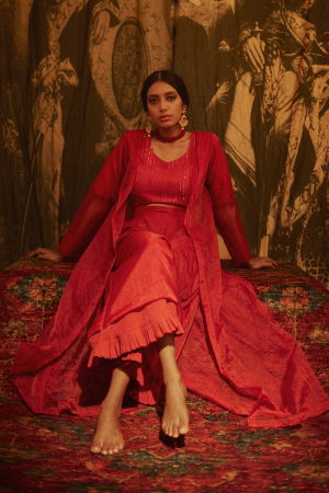 The Nilofer Pant and Jacket set from the Bindi: The Modern Day Maharani collection is a striking fusion of traditional craftsmanship and contemporary elegance. Crafted in handloom fabric with intricate zari detailing and a delicate organza overlay, this three-piece ensemble features a backless top adorned with zari-woven stripes and a dori knot, highlighting the artistry of textile manipulation. The top is complemented by a slim-fit pant with a pleated detail at the base, offering both structure and fluid movement. The organza fabric is carefully lined for comfort and a refined drape, while the chilli red hue adds a vibrant, festive energy to the design. Dyed using organic methods, the piece reflects a commitment to sustainable practices without compromising on visual impact. Ideal for festive occasions and glamorous parties, this set blends cultural heritage with modern silhouettes, making it a standout choice for the discerning wearer.