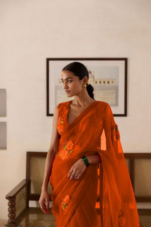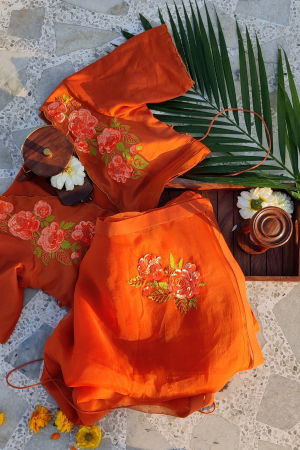 Delicate peach roses embroidered all over the saree in our signature pattern. This saree can be paired with a peach or white blouse as per preference.