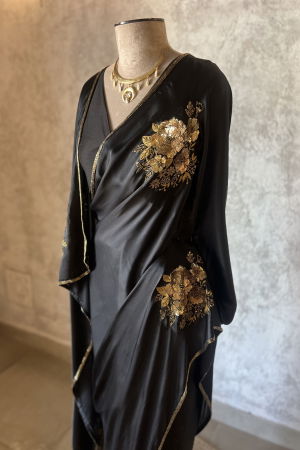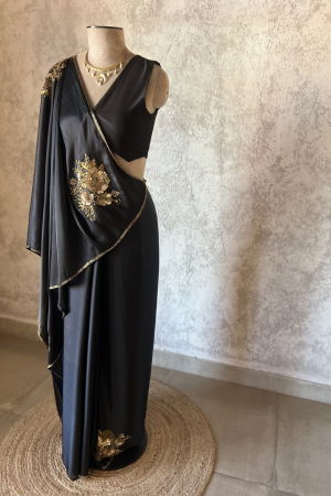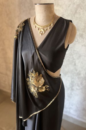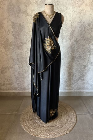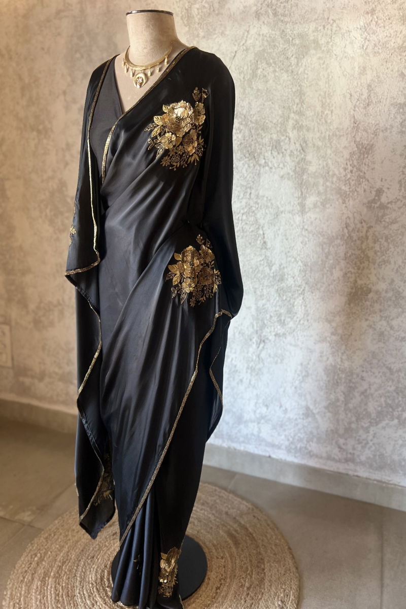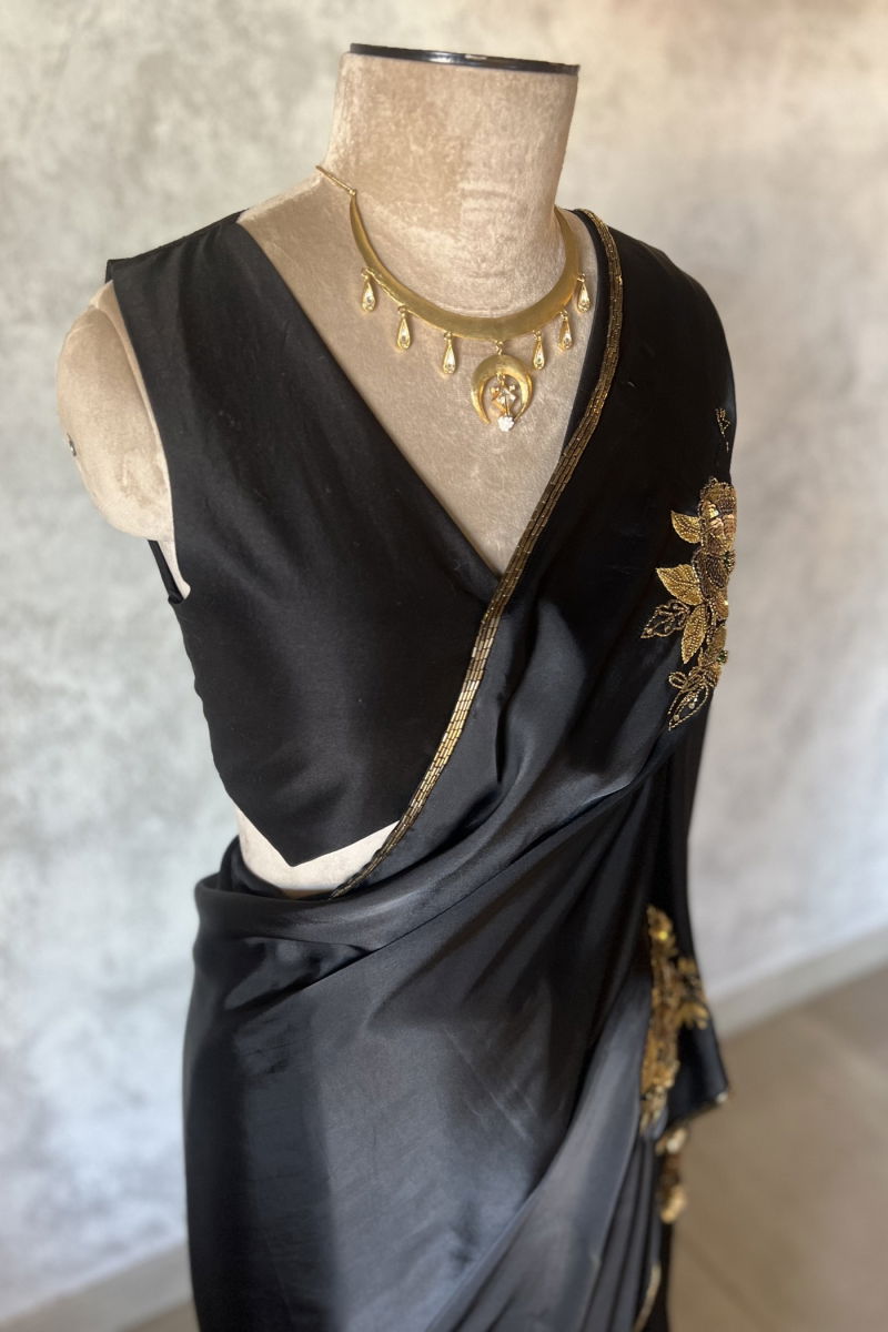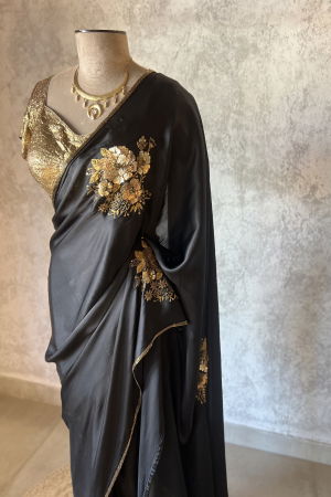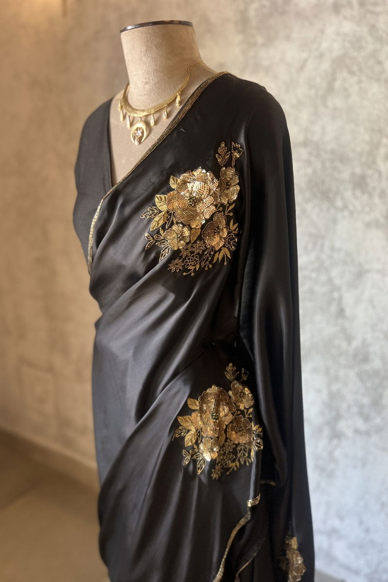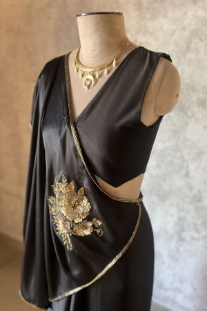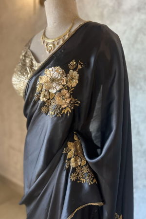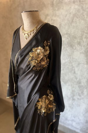 The Paro Black Satin Saree is a breathtaking combination of sophistication and grace. Featuring a rich black hue and crafted from airy silk organza, it offers a light, translucent drape that enhances its fluid elegance. The saree may include delicate embellishments or intricate patterns, adding a refined touch to its striking color. Perfect for formal events or celebrations, it beautifully marries classic charm with contemporary style.