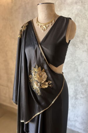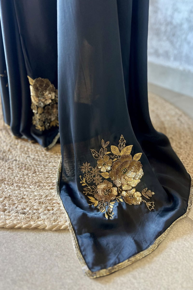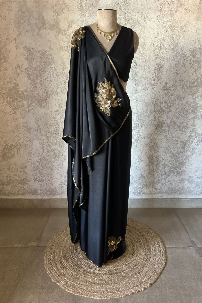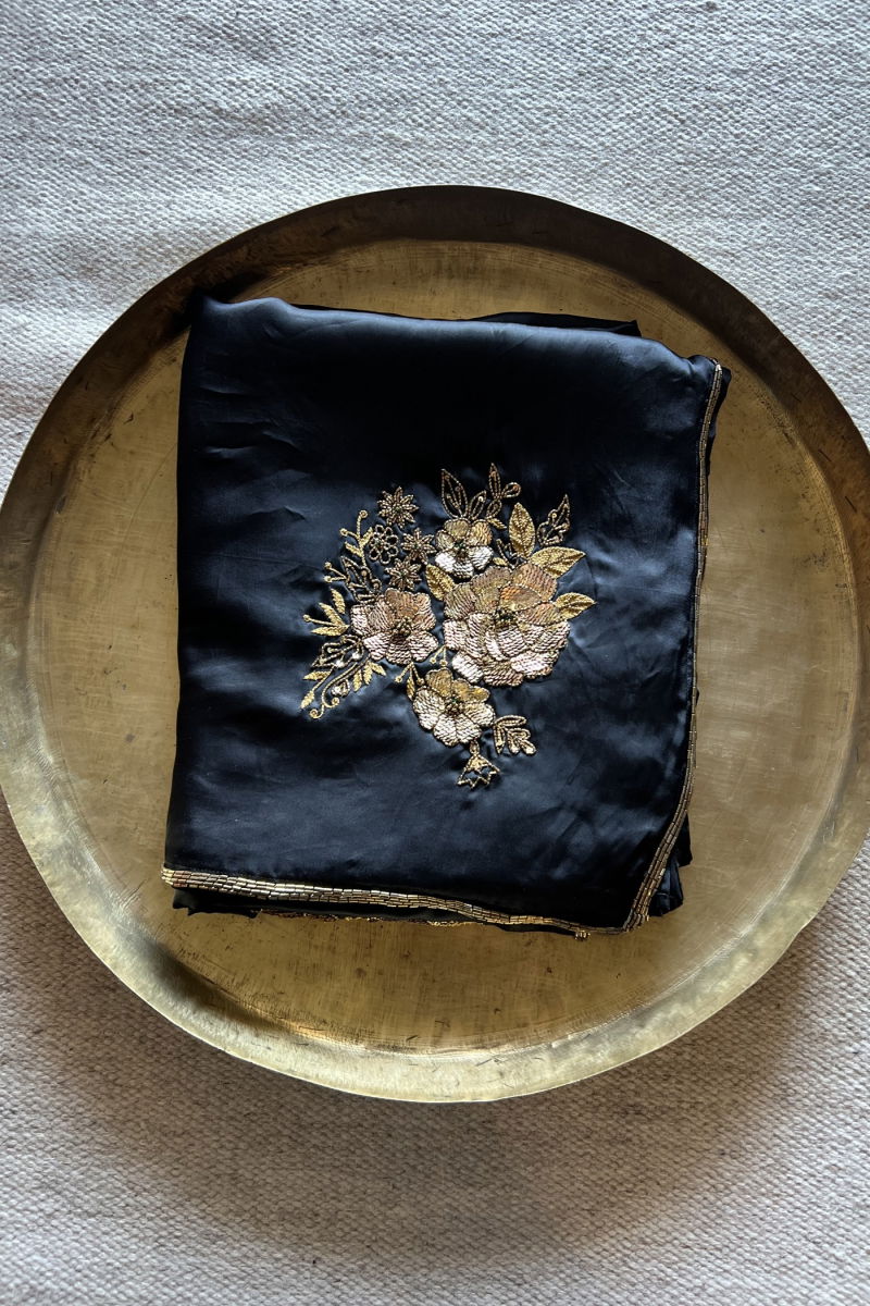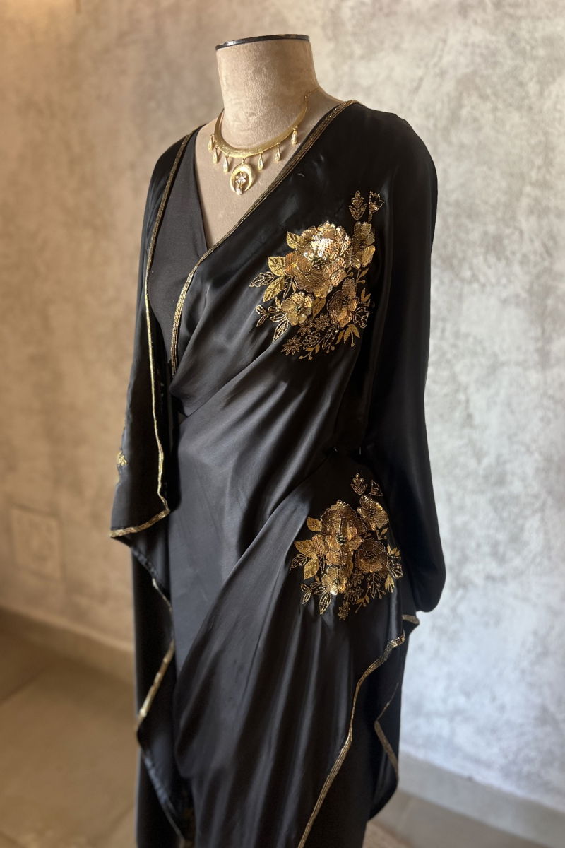 The Paro Black Satin Saree is a breathtaking combination of sophistication and grace. Featuring a rich black hue and crafted from airy silk organza, it offers a light, translucent drape that enhances its fluid elegance. The saree may include delicate embellishments or intricate patterns, adding a refined touch to its striking color. Perfect for formal events or celebrations, it beautifully marries classic charm with contemporary style.