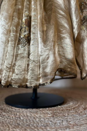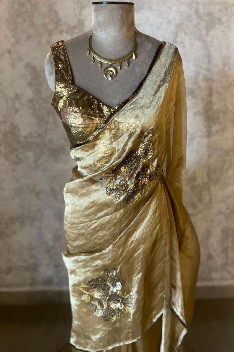 Product Description | The Paro Gold Silk Tissue Saree is a captivating blend of elegance and sophistication, designed for those who appreciate timeless fashion with a modern touch. Crafted from luxurious silk organza, this saree features a lightweight, sheer texture that drapes beautifully, creating a graceful and ethereal silhouette. The deep black hue exudes confidence and allure, making it the perfect choice for evening events, weddings, and festive occasions. With a subtle sheen that enhances its charm, this saree is a statement of refined taste and elegance. Whether styled with statement jewelry for a bold, regal look or paired with minimal accessories for a sleek and sophisticated appearance, the Paro Gold Silk Tissue Saree ensures a striking presence at any special occasion. |