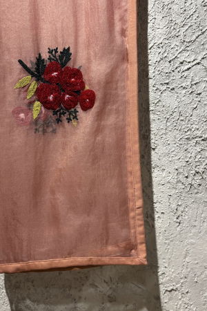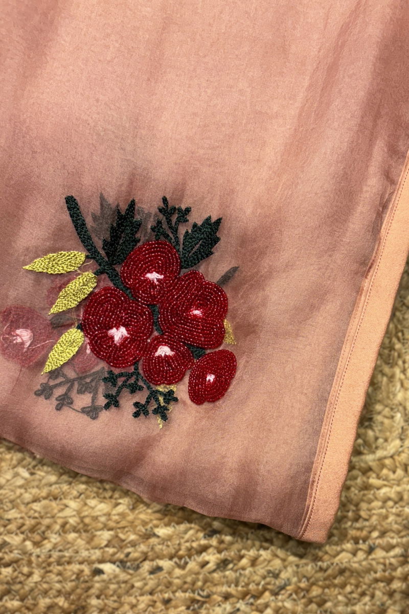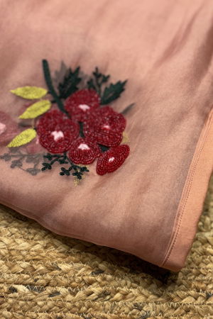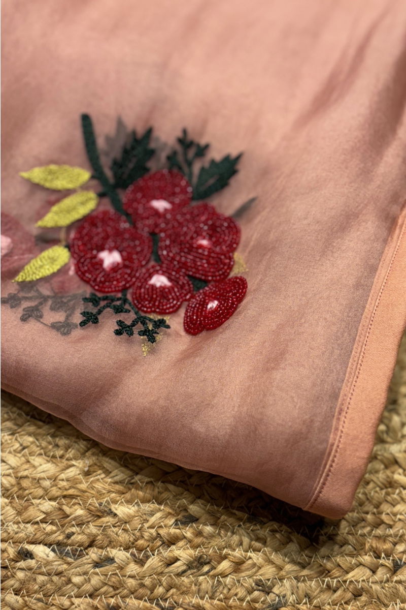Embrace the timeless charm of Indian craftsmanship with the Organza Kesar Dupatta, a stunning display of hand embroidery and textile surface artistry, destined to captivate hearts.