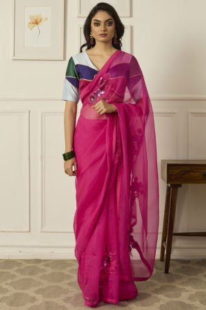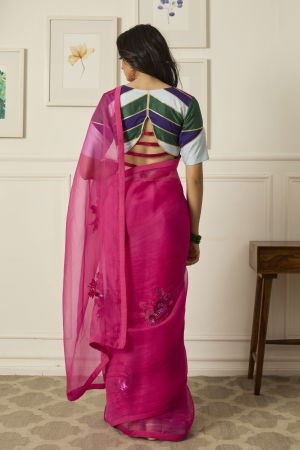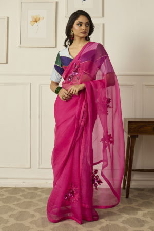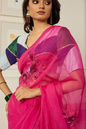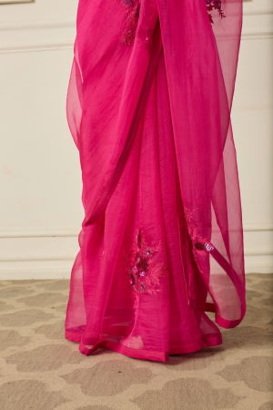 The Pink Aradhana Saree, part of the 'Gul: A Blooming Flower' collection, is a meticulously crafted piece of pure silk organza that exudes elegance and timeless charm. Distinguished by its Peacock Pink hue, this saree features a delicate floral motif enhanced with hand-embroidered resham leaves scattered across the fabric, showcasing the artistry of traditional craftsmanship. Each element is thoughtfully executed through hand embroidery, organic dyeing, and textile manipulation, ensuring a unique and authentic finish. Designed for a breathable fit, it offers comfort without compromising on style, making it ideal for a range of occasions including weddings, sangeet, mehandi, engagement ceremonies, festive gatherings, brunches, parties, and even lounging. Its fresh, subtle aesthetic makes it a versatile addition to any wardrobe, especially for those seeking a refined look for special events. Pair it with a matching or contrasting blouse to accentuate its beauty and create a stunning ensemble that captures the essence of grace and sophistication.