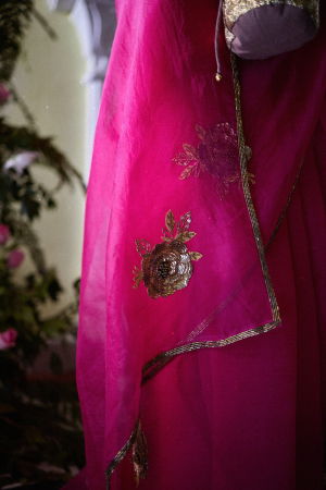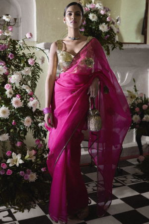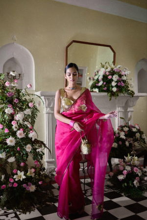 The Pink-Gold Paro 2 Saree, part of the exclusive Mehafil collection, is a masterful fusion of elegance and craftsmanship. Crafted from premium silk organza, this saree features a luxurious peacock pink base that radiates soft opulence, enhanced by delicate gold accents that shimmer with every movement. Adorned with intricate hand embroidery, each motif is meticulously stitched by skilled artisans, reflecting timeless artistry and attention to detail. Designed with a breathable fit, it ensures comfort without compromising on style, making it ideal for a range of occasions—from festive celebrations and bridal trousseau moments to intimate gatherings like mehandi, haldi, and sangeet ceremonies. Its versatile appeal extends to casual brunches, cocktail parties, and everyday lounging, blending sophistication with ease. Available for immediate shipping, this saree is a statement piece for the modern woman who values both tradition and contemporary grace, perfectly suited for Diwali, Republic Day, Karwa Chauth, and other special occasions.