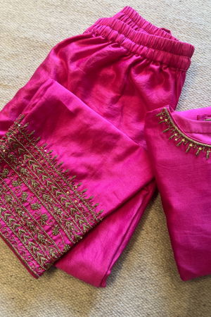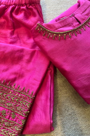A vibrant ensemble inspired by the fiery hues of the Gulmohar flower, this kurta set features rich pink tones that exude elegance and grace. Perfect for festive occasions, the set includes a finely tailored kurta with intricate embroidery, paired with comfortable bottoms, creating a harmonious blend of tradition and style.