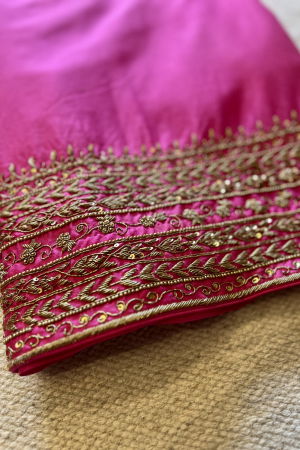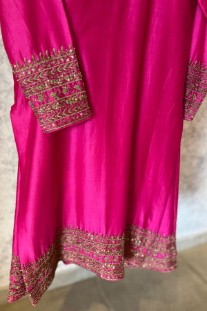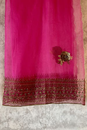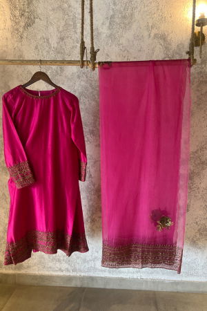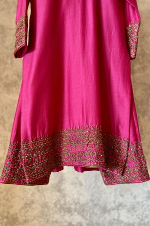 Product Description | Indulge in ethereal elegance with this silk Kurta Set. Adorned with hand embroidery, this ensemble captures the essence of blooming beauty. The pink color adds a sense of feminity and sweetness. |