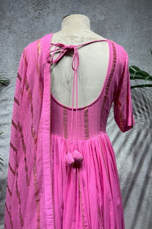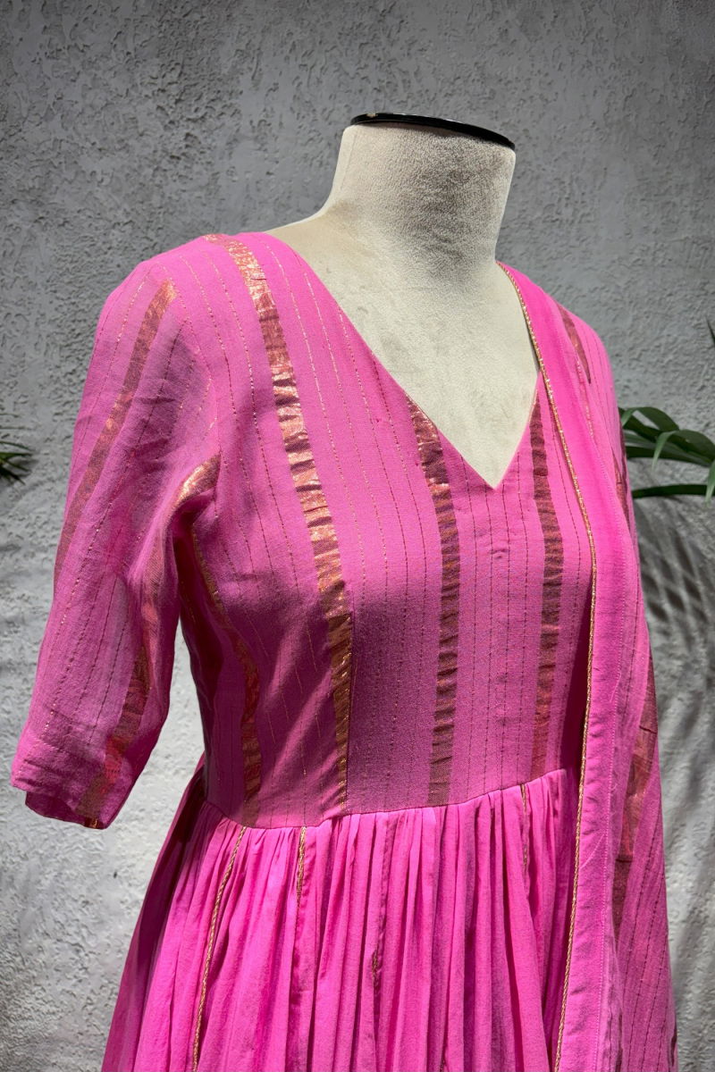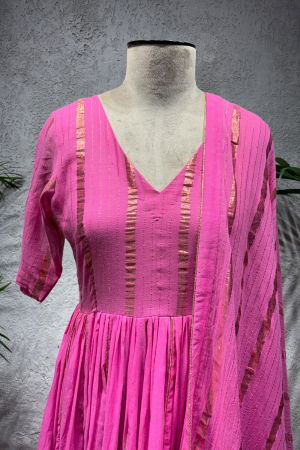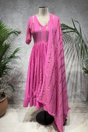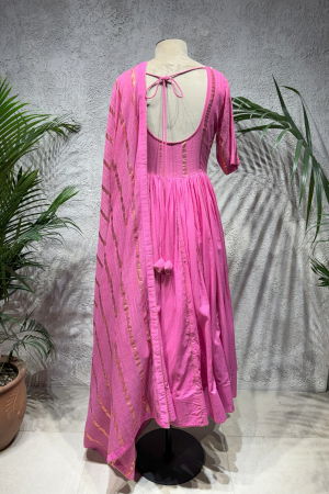 Product Description | PINK RUPALI ANARKALI Rose Cotton Anarkali With Scalloping Details on the Neck with Gota Detals, Chanderi Dupatta with Gota Border |