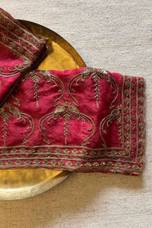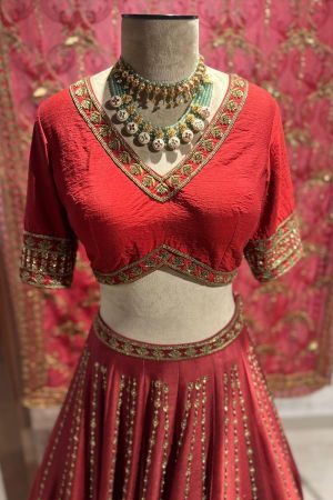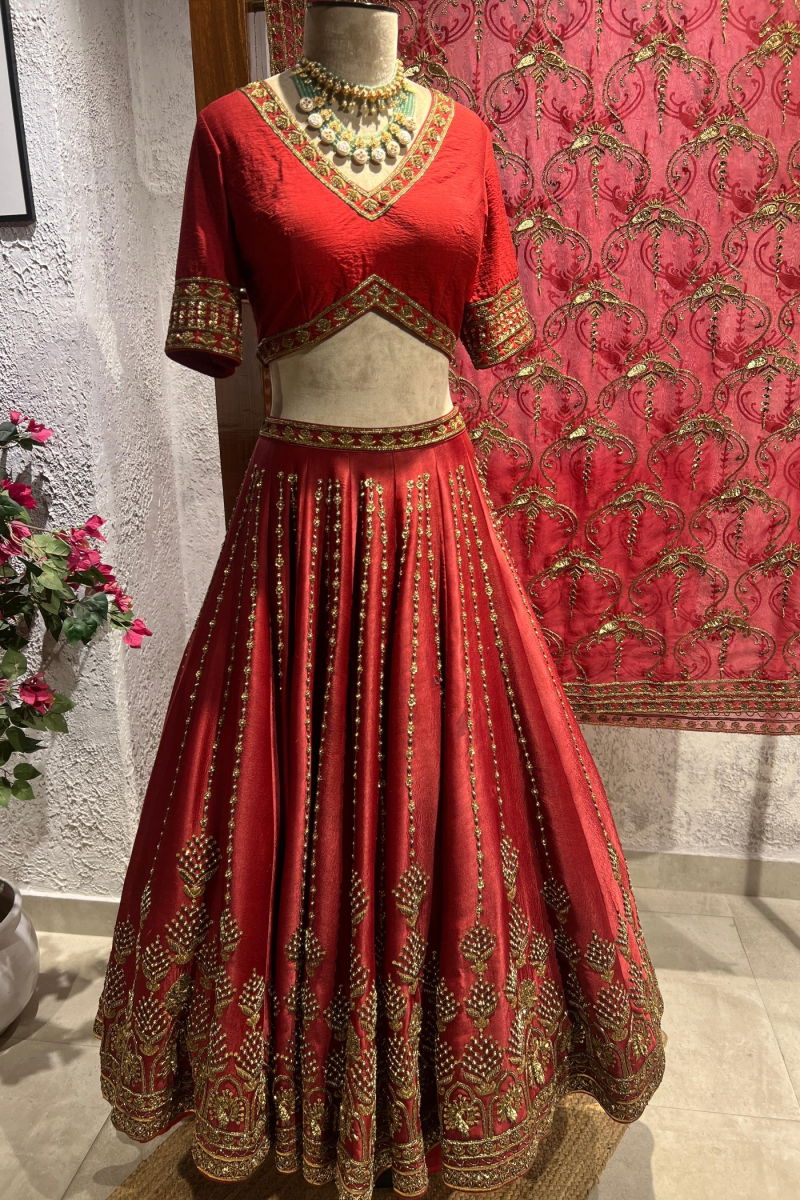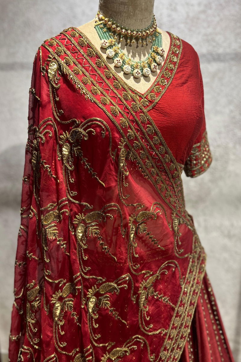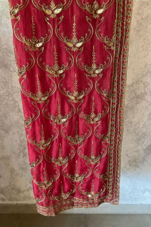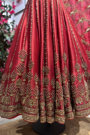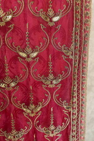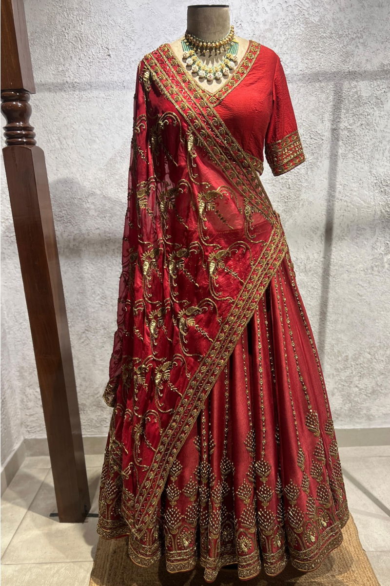 Contents | Featured in red colour dupion silk this wedding lehenga is embroidered heavily in zardozi embroidery. The blouse is also in dupion silk with very dense zardozi embroidery. Both dupattas are in net and tissue with four-sided borders and butties inside. |