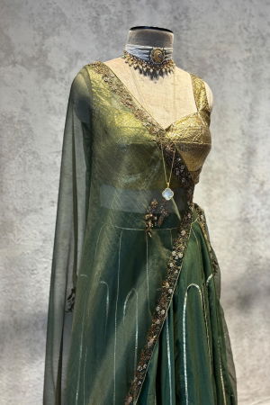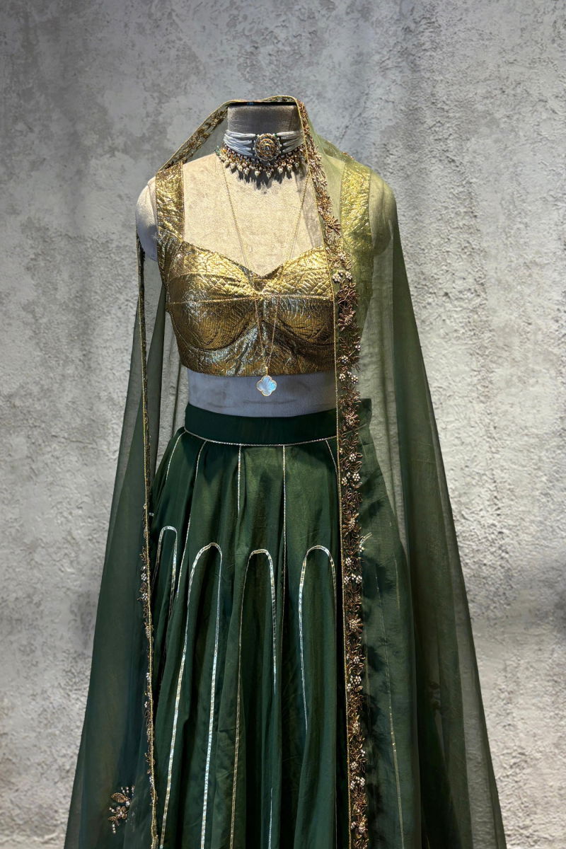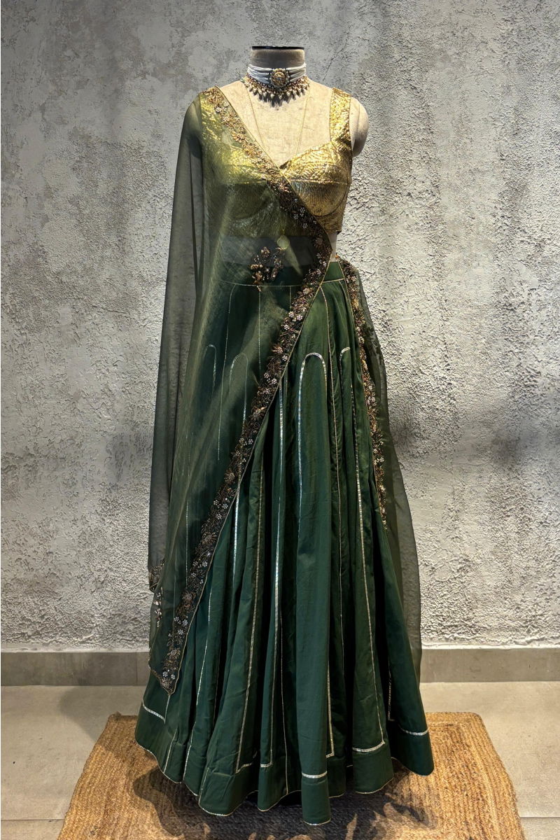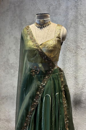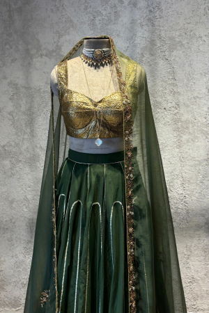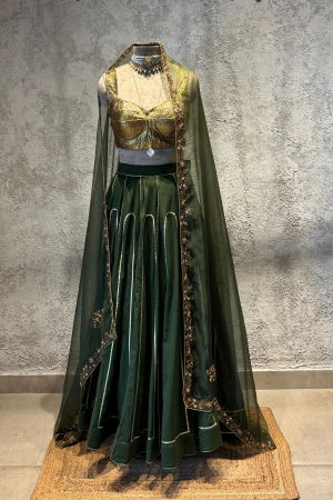 Product Description | Step into timeless elegance with the Ragini Green Lehenga Set, a perfect blend of traditional charm and contemporary sophistication. This ensemble features a beautifully flared lehenga in a rich, earthy green tone, adorned with delicate embroidery and subtle embellishments that catch the light with every move. |