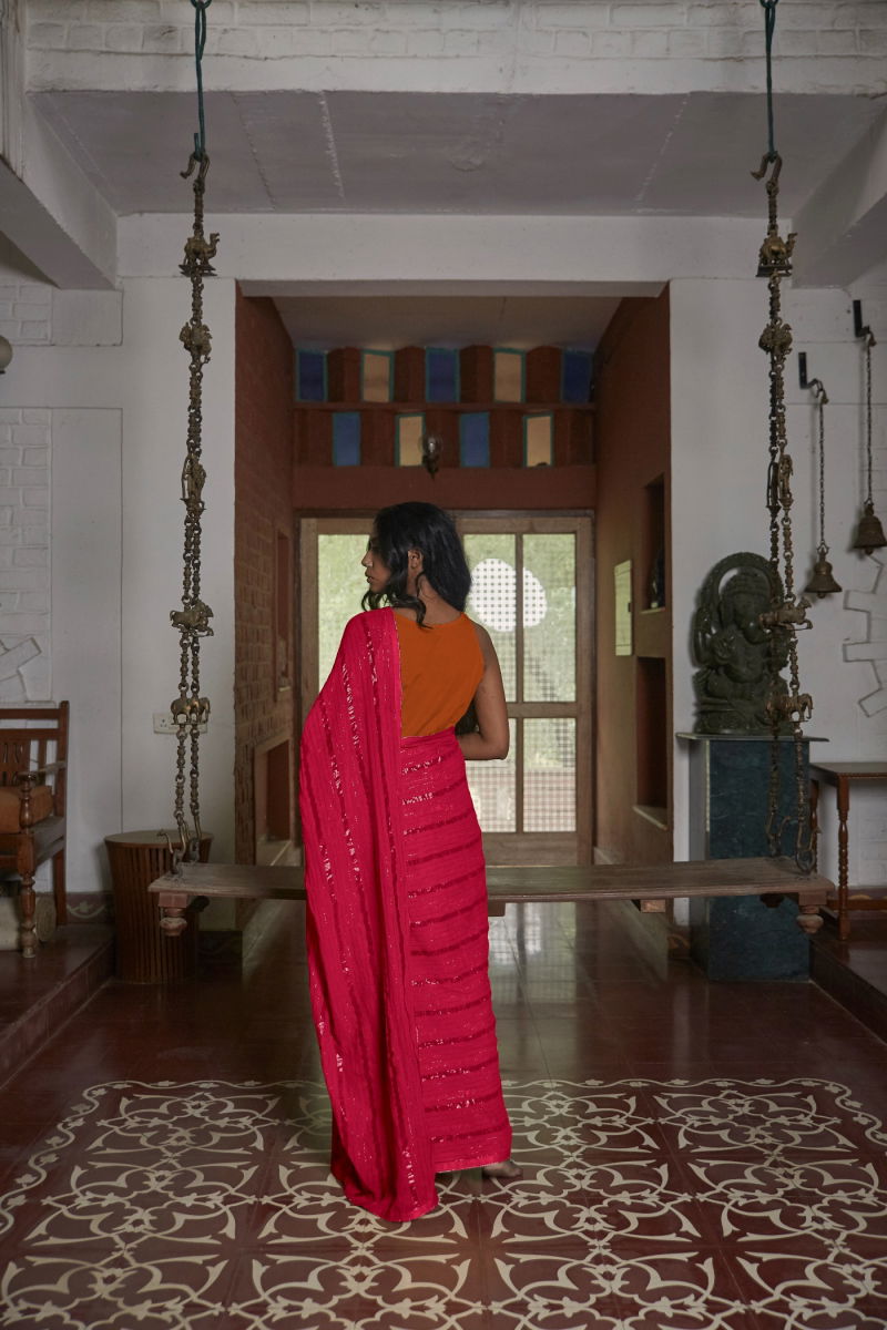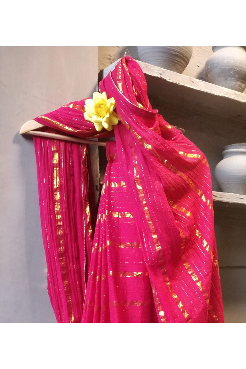 Rani pink chanderi saree is a mix of cotton fiber detail with a gotta border. This is a perfect look for any ritual celebration majorly because of the comfortable drape and breezy feel.