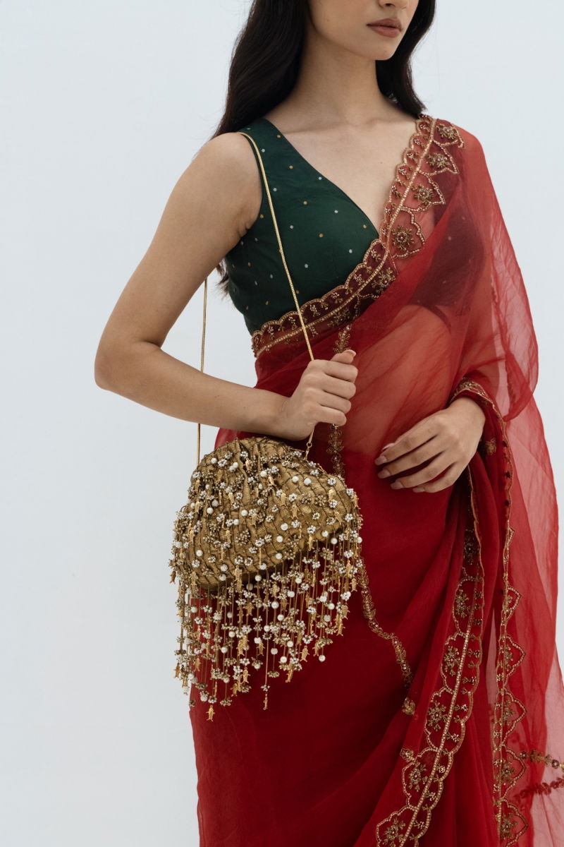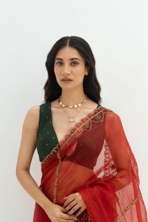 The RED MEHFIL SAREE, part of the exquisite Mehfafil collection, is a stunning fusion of elegance and craftsmanship, meticulously crafted from premium silk organza. Its rich, deep red hue radiates confidence and grace, making it a perfect choice for a wide array of occasions including weddings, mehandi ceremonies, sangeet events, engagements, receptions, and festive gatherings. Designed with a slim fit silhouette, the saree drapes beautifully, accentuating the wearer’s form with subtle sophistication. The true essence of this saree lies in its intricate hand embroidery, a testament to traditional artistry and attention to detail. Each thread is carefully placed by skilled artisans, transforming the fabric into a wearable masterpiece. Ideal for those seeking a blend of contemporary style and cultural heritage, this saree is not just an outfit but a statement of timeless beauty. Available through Peeli Dori Online Store, it is a must-have for brides and fashion-forward women alike, especially during special celebrations like Republic Day and wedding seasons.