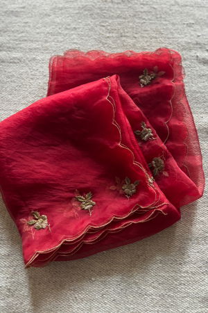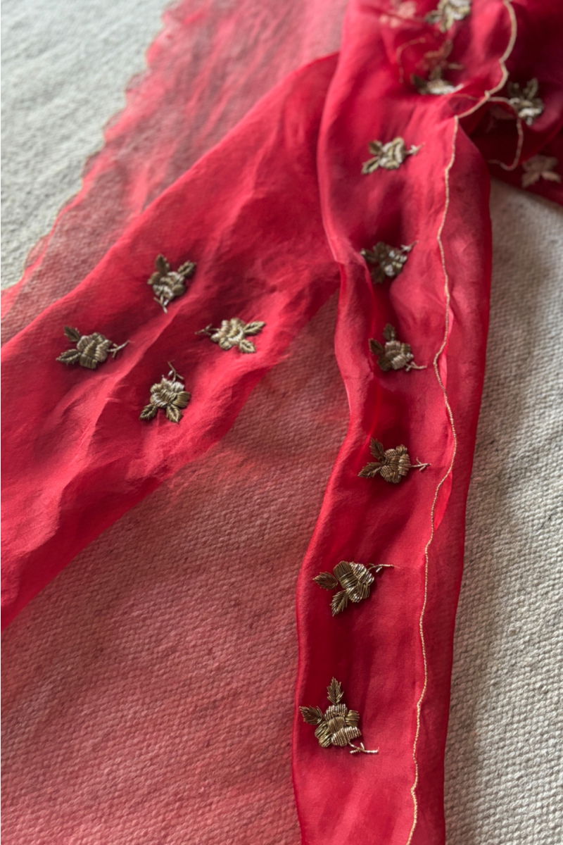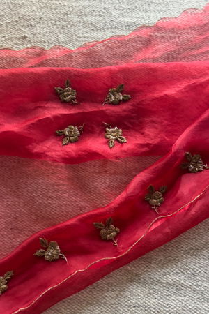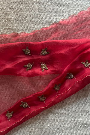 The stunning beauty of a Rosein dupatta embellished with intricate hand embroidery in gold evokes a sense of classic charm and grandeur. The vibrant shade of red signifies warmth, enthusiasm, and creativity, while the shimmering golden threads lend an element of opulence and luxury.