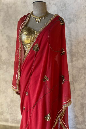 The RED SIANA CHIFFON SAREE, part of the exclusive MEHAFIL collection by Peeli Dori, embodies timeless elegance with its rich red hue and exquisite craftsmanship. Made from premium French chiffon, the saree features a lightweight, sheer texture that ensures a graceful, fluid drape, offering both comfort and sophistication. The fabric’s delicate structure enhances the saree’s overall presence, making it ideal for a range of occasions including weddings, engagements, cocktail parties, and festive gatherings. Adorned with intricate hand embroidery, each detail reflects meticulous artistry, adding depth and refinement to the design. The slim fit silhouette accentuates the wearer’s form while maintaining ease of movement, perfect for both formal events and relaxed settings. Designed for the modern woman who values tradition with a contemporary touch, this saree is a versatile addition to any wardrobe. Its vibrant red shade exudes warmth and romance, making it a standout choice for trousseau collections and special celebrations. Available through Peeli Dori Online Store, the RED SIANA CHIFFON SAREE is a celebration of craftsmanship, color, and timeless style.