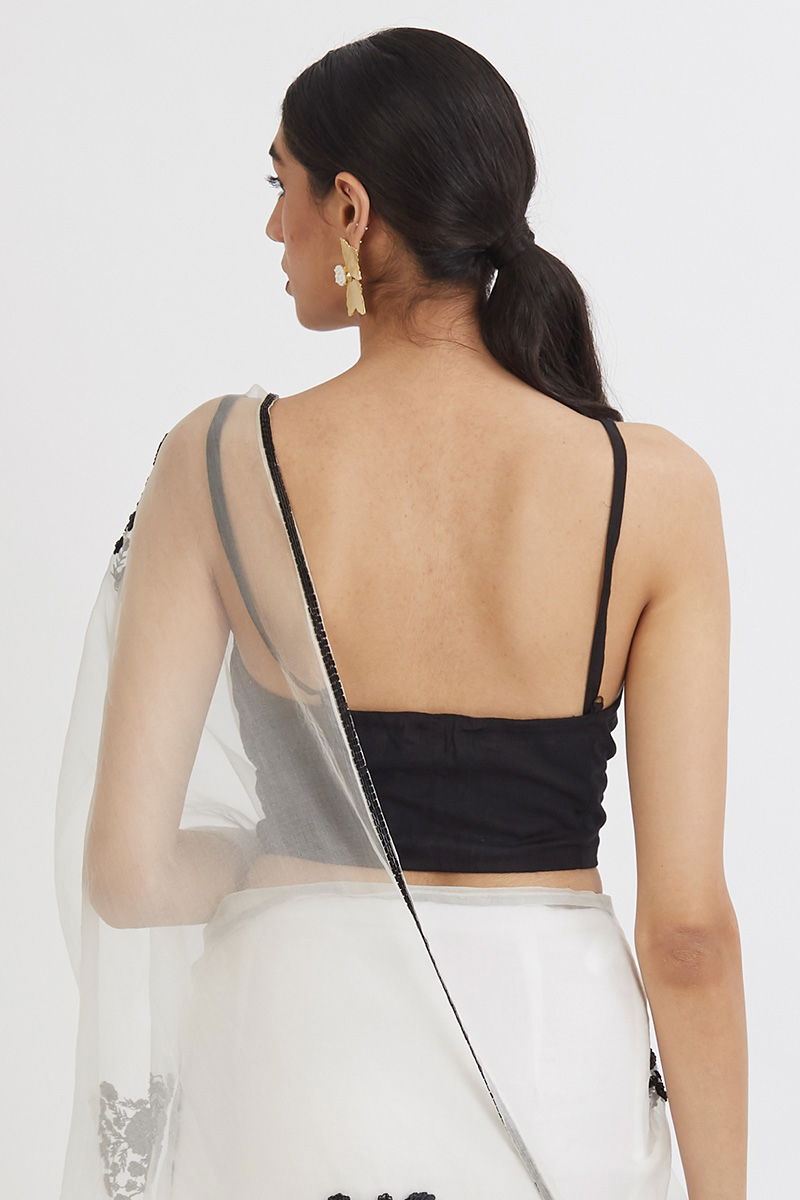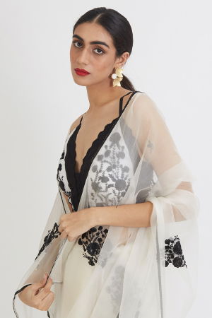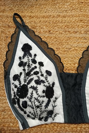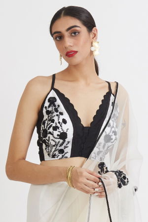 Reet Ivory Blouse, an exquisite piece that combines classic elegance with intricate design. Crafted from luxurious silk organza, this blouse features timeless black embroidery that adds a touch of sophistication and artistry to its soft ivory hue. The delicate black embroidery along the neckline and body of the blouse creates a striking contrast, making it an eye-catching statement piece for any wardrobe. The scalloped edge detailing enhances the blouse’s overall design, elevating its beauty to a whole new level. The scalloped finish adds a unique and feminine touch, offering a high-fashion feel that sets this blouse apart. Whether you're attending a formal event or looking to add elegance to your everyday look, this blouse effortlessly bridges the gap between tradition and contemporary style.