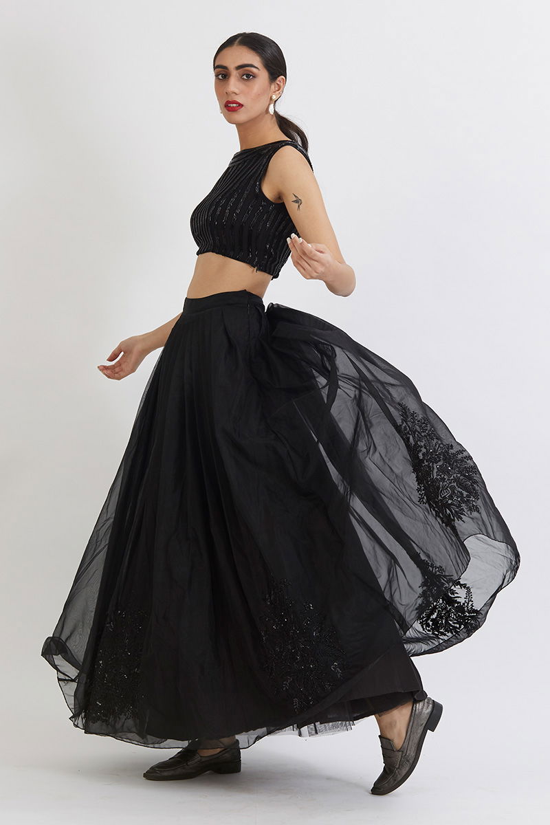 A chic detail of black and white on silk organza, this lehenga set is a French floral detail of black on black. The dainty black florals are something to cherish. Complete this look with white pearls to make it magical!