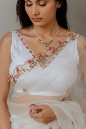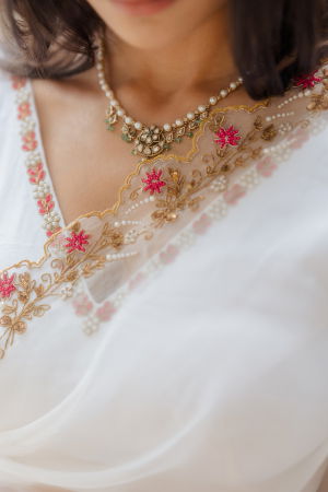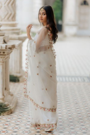Talking out party wear saris, this detailed gold embroidery drape made with silk organza stands out with its glamorous and sensual appeal. You can accessorize this white organza saree with pearls for a resort wedding happening during the day or with dazzling diamond earrings for an evening ball.