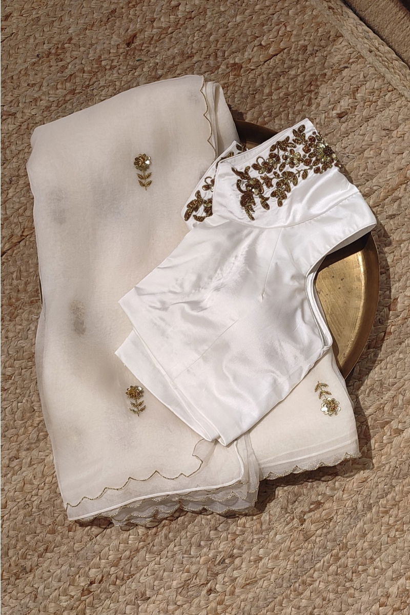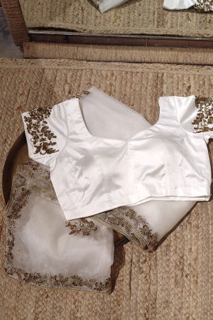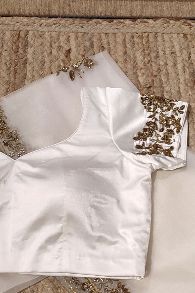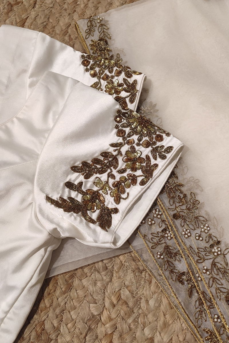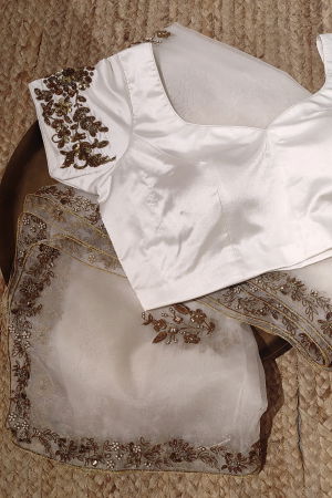 Step into elegance with this exquisite off-white blouse adorned with intricate hand embroidery, designed to captivate every gaze it meets. Crafted with meticulous attention to detail, the blouse boasts a timeless charm that effortlessly elevates any ensemble.