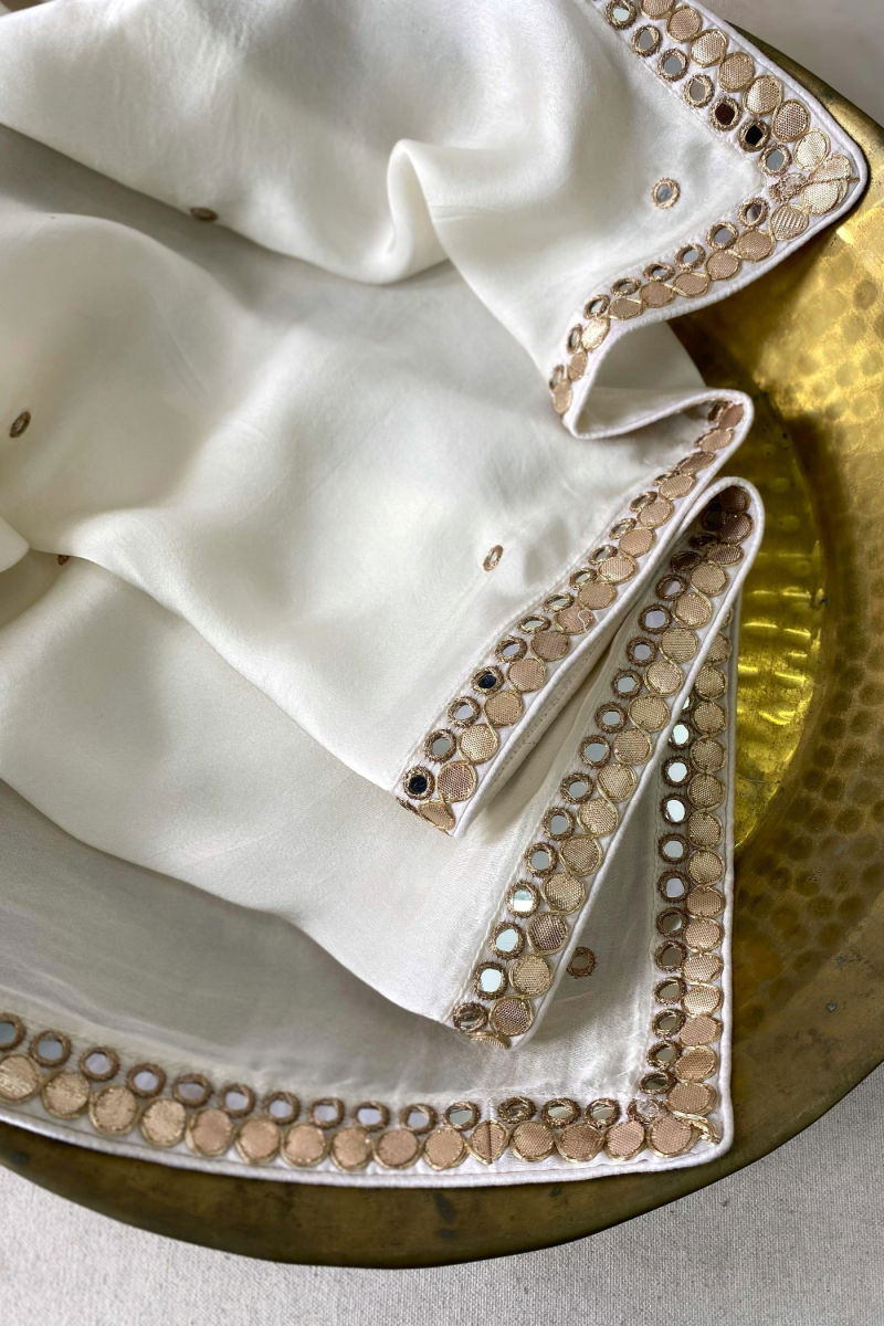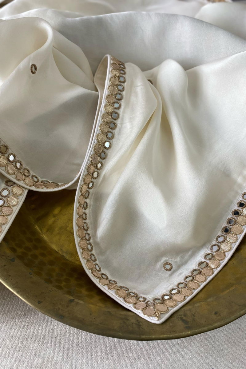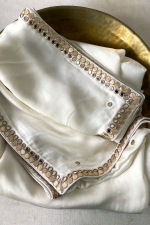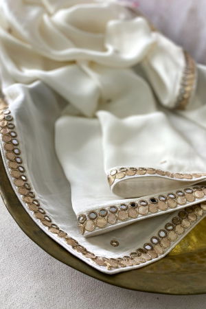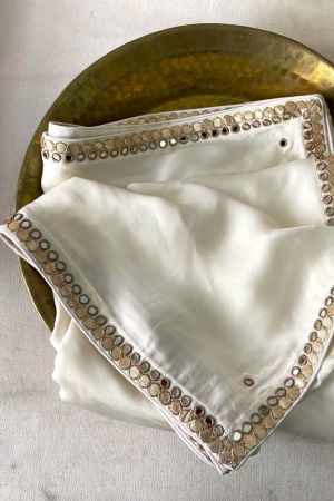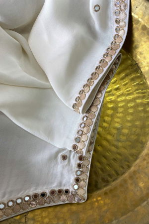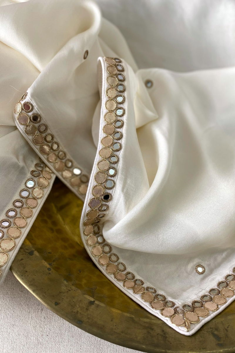 The RIVERA IVORY SATIN DUPATTA, part of the exclusive Mehafil collection, is a masterful blend of tradition and elegance, crafted from premium silk organza for a luxurious, lightweight drape. Its ivory hue radiates timeless sophistication, offering a refined canvas that complements a wide range of ensembles. Meticulously hand-embroidered with intricate detailing and dyed using organic pigments, each dupatta reflects a commitment to sustainable craftsmanship and artisanal excellence. Designed to evoke the serene flow of rivers, the piece features a harmonious palette of soft pastels and subtle hues, inspired by nature’s delicate beauty. Ideal for a variety of occasions, it seamlessly transitions from festive celebrations and weddings to intimate gatherings like mehandi, sangeet, and engagement ceremonies. Whether worn as a statement accessory or paired with a saree or lehenga, the Rivera Dupatta ensures effortless grace and enduring charm. Its delicate texture and enduring durability make it a cherished addition to any wardrobe, perfect for gifting or personal indulgence.