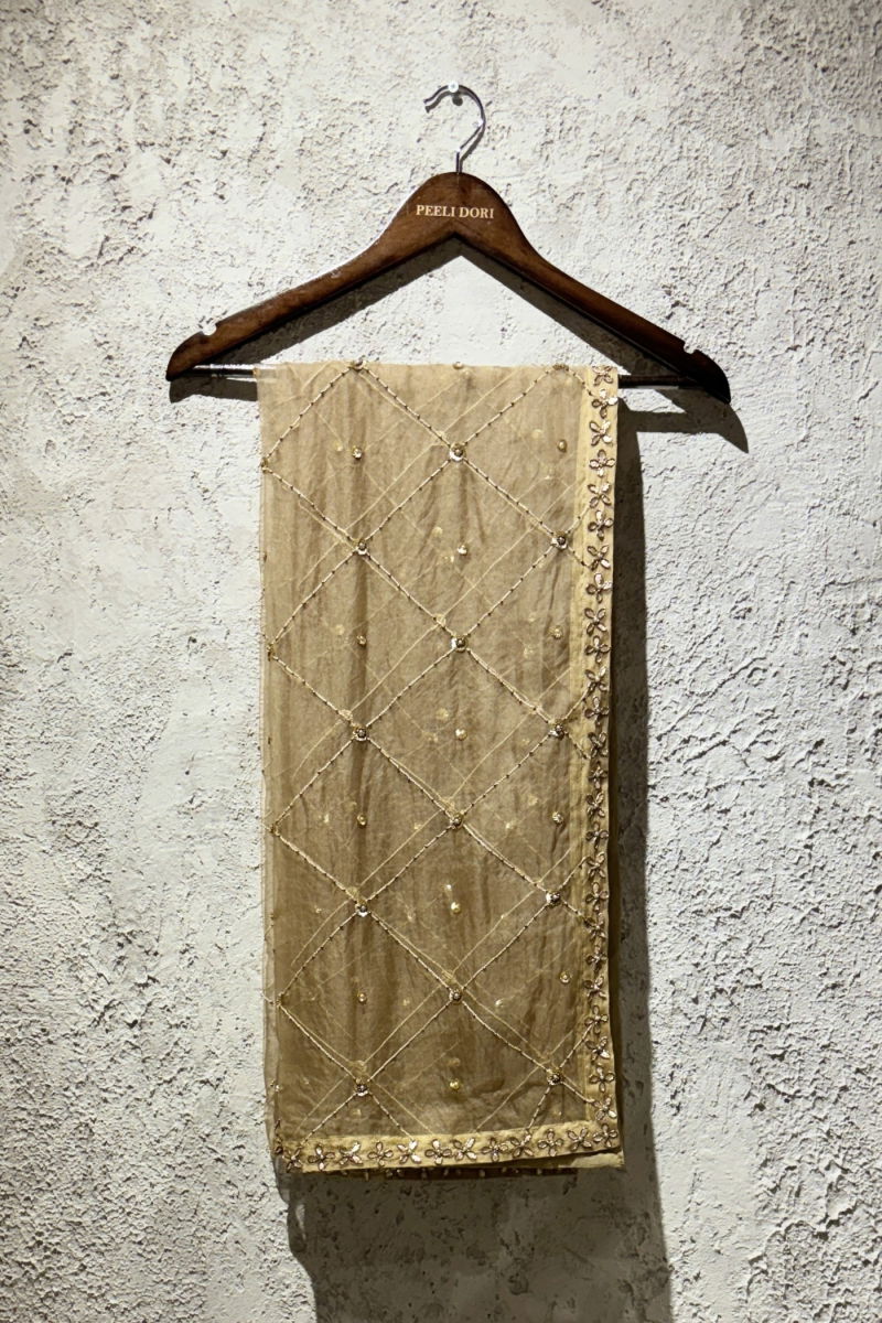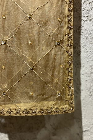 The beautiful blend of a riwayat silk organza dupatta, embellished with golden hand embroidery, creates a breathtaking sight that radiates a sense of refinement and elegance. Every delicate aspect, carefully fashioned by experienced craftsmen, showcases an ageless allure and a tribute to the embroidery's affluent heritage.