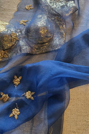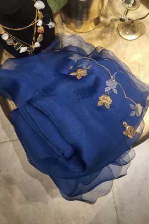 The Rosein Organza Saree is a stunning piece of attire that effortlessly blends elegance and charm. Crafted from lightweight and sheer organza fabric, this saree features a captivating shade of blue adorned with delicate rose patterns. Its soft texture and subtle sheen add a touch of sophistication, making it perfect for both formal occasions and festive celebrations. The intricate floral design enhances its graceful appeal, ensuring you stand out with timeless beauty and poise.