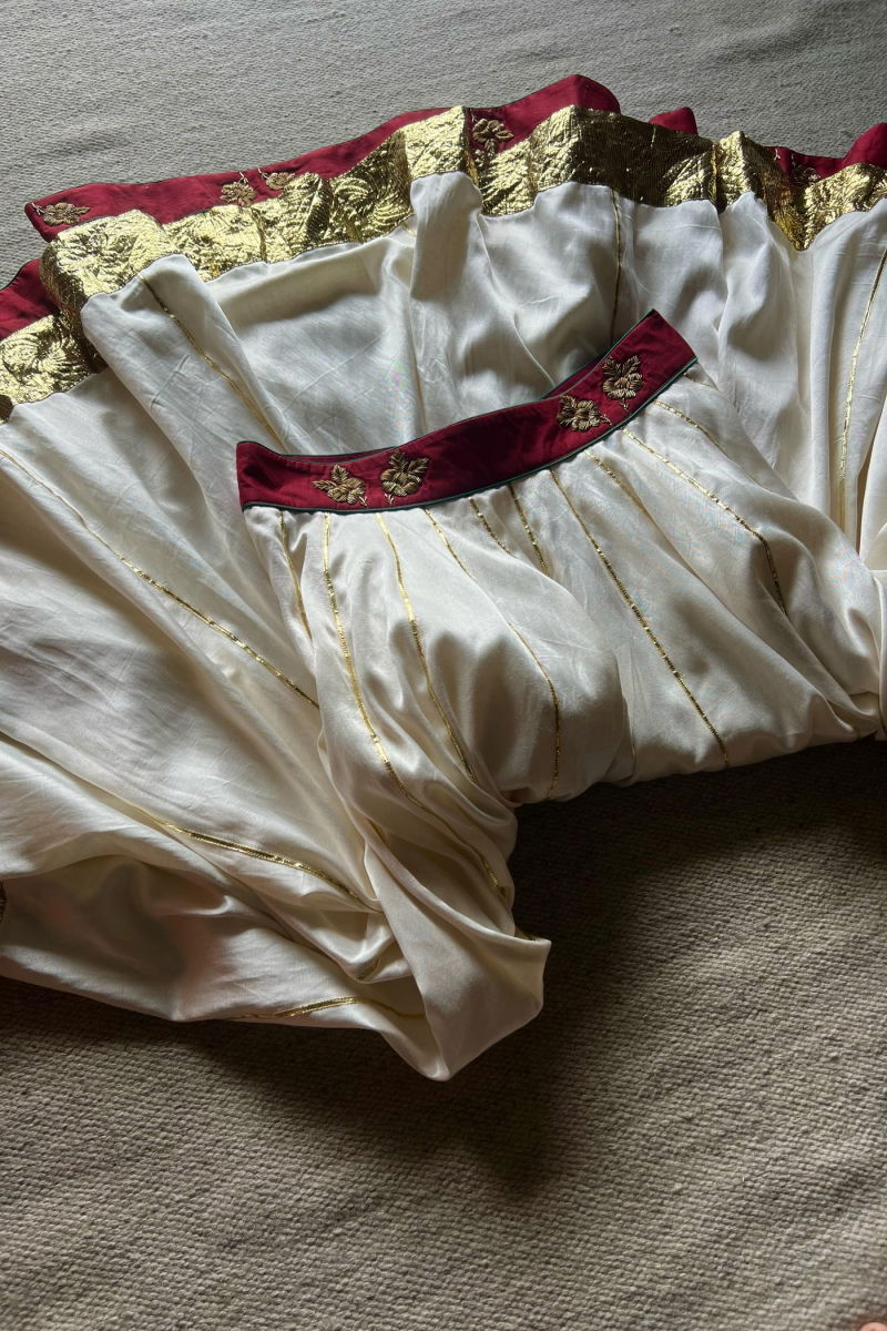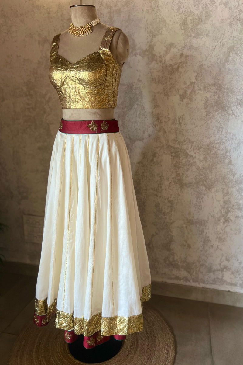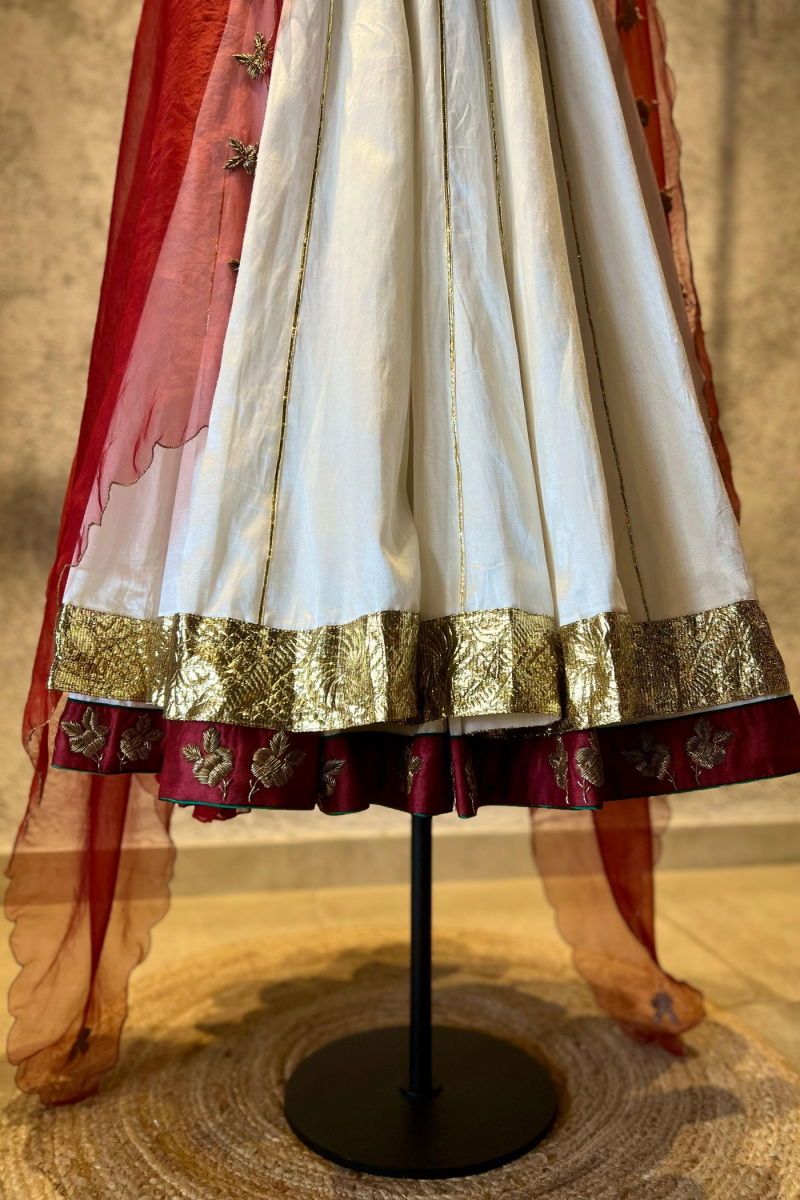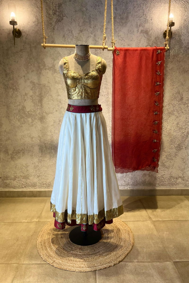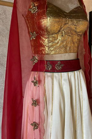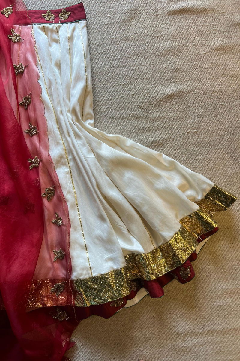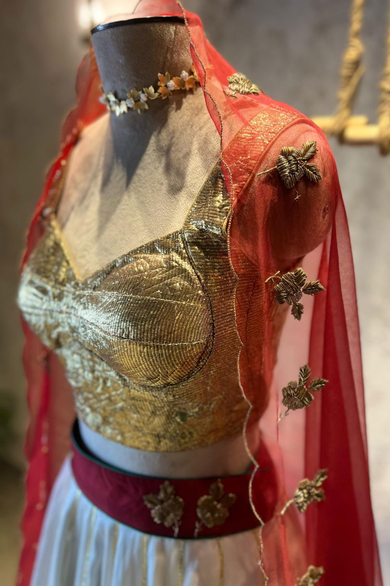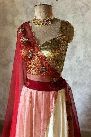The delicate hand embroidery is the highlight of this enchanting lehenga set. Our skilled artisans have poured their expertise into every stitch, ensuring that each pearl and sequin is perfectly placed. The result is a stunning symphony of shimmering embellishments that adds a touch of opulence to the red canvas.