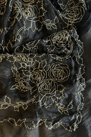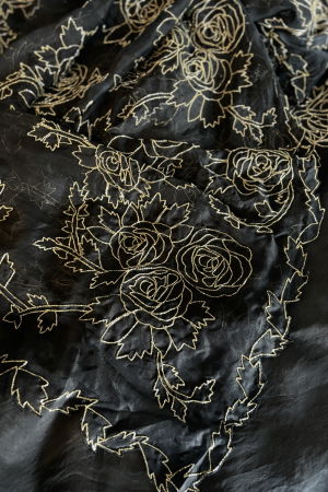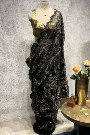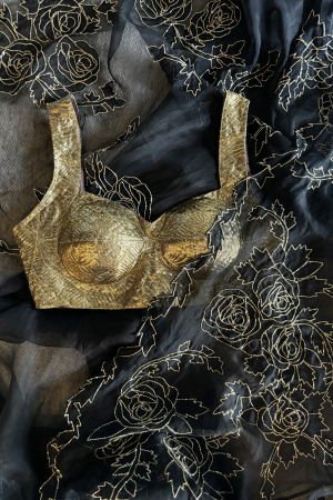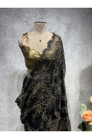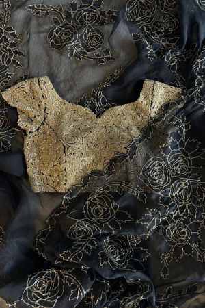 The Rosy Black Saree is a luxurious fusion of rich black silk and airy organza. Its graceful drape is accentuated by delicate rosy embellishments, offering a perfect balance of sophistication and modern charm. Ideal for special occasions, this saree exudes elegance and refinement with every wear