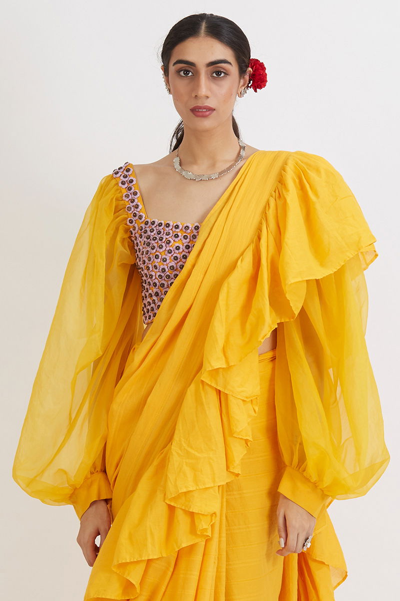 Product Description | Elevate your style with the Ruffle Blouse, a chic and feminine piece crafted from a luxurious blend of cotton satin and organza. The blouse features beautifully textured ruffle sleeves, adding a playful yet sophisticated flair to its overall design. Delicate crochet flowers are meticulously hand-embroidered, lending an artisanal touch that enhances the blouse's vintage-inspired charm. The cotton satin provides a soft, smooth finish with a subtle sheen, while the organza fabric offers an airy, lightweight feel that drapes beautifully. This combination of fabrics creates a blouse that's both elegant and versatile, perfect for everything from casual outings to more formal events. |