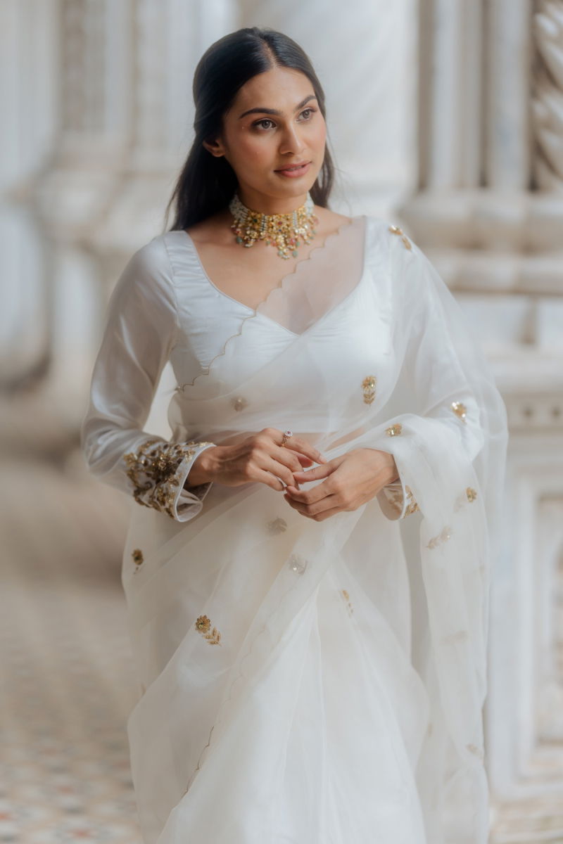Fascinate the crowd by adorning this off-white coloured blouse, crafted from luxurious cotton satin. Intricately detailed with a delicate zari and thread-embroidered border, this piece is further elevated with shimmering sequins and bead embellishments, creating a perfect harmony of tradition and contemporary charm. The soft sheen of the fabric, paired with the meticulous handwork, exudes effortless grace, making it a must-have for festive occasions, weddings, and celebrations. Pair it with a contrasting lehenga or a classic saree to make an unforgettable statement wherever you go.