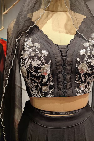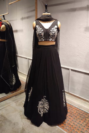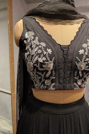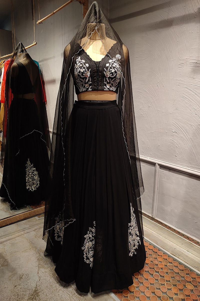 Contents | A beautiful Black and Silver Reet Lehanga Set. The set includes georgette lehenga with hand embroidered details all over the lehenga, hand embroidered at peelidori |