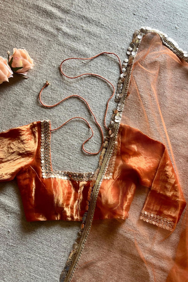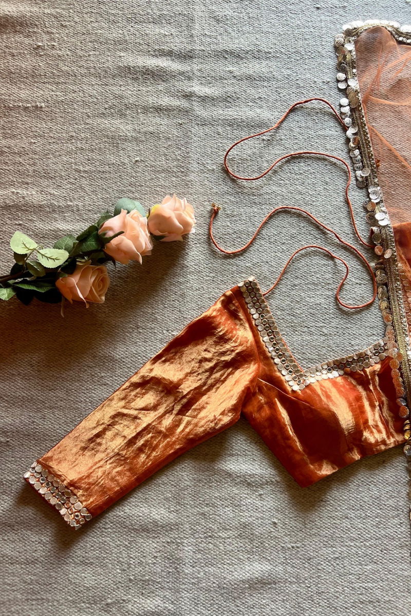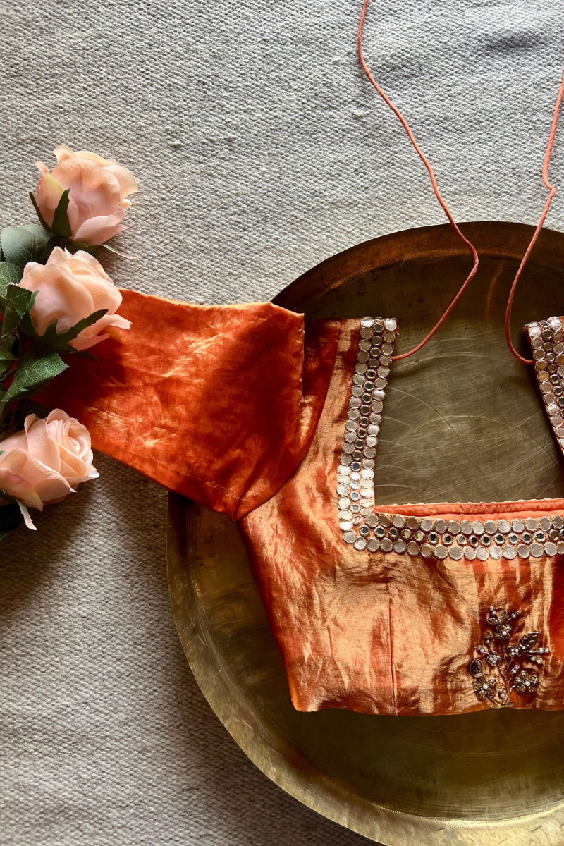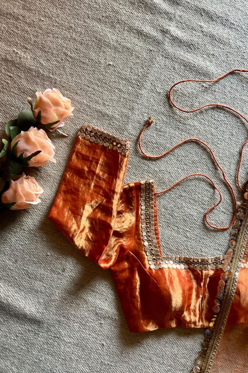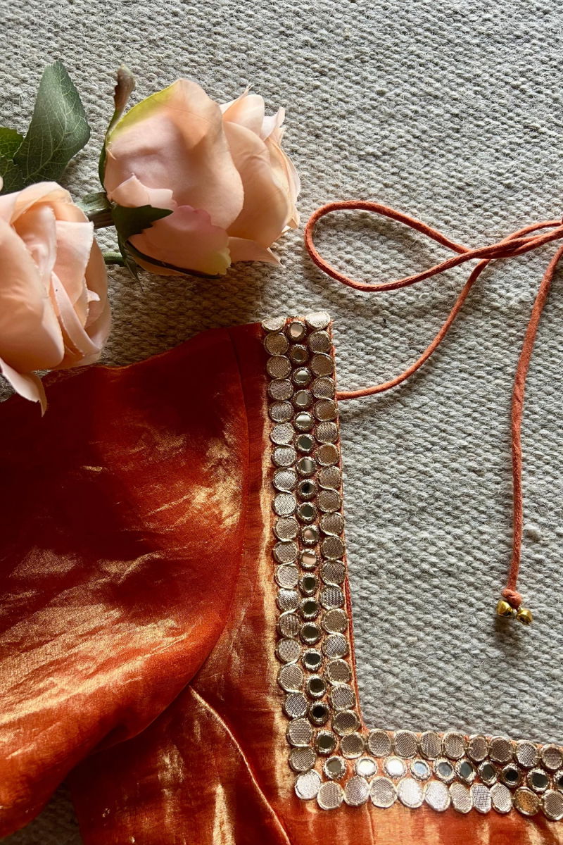 Silk Blouse, Rust Silk, Elegant Wear, Luxury Fashion, Lightweight Blouse, Silk Tissue, Timeless Style, Sophisticated Look, Effortless Chic, Designer Blouse, Festive Wear, Formal Fashion, Casual Elegance, Wardrobe Essential, Versatile Style.