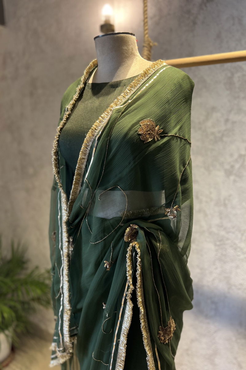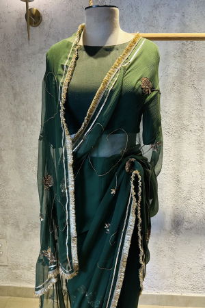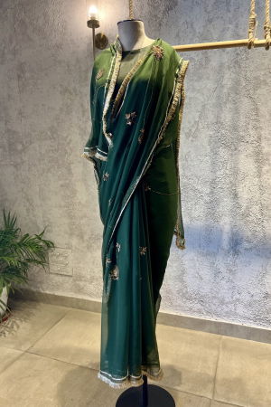 The Siana Green Saree is a masterpiece of elegance and sophistication, perfect for those seeking a blend of traditional charm and modern allure. This saree is crafted from the finest chiffon, known for its lightweight and sheer texture that offers a delicate yet structured drape. The Greeb hue of the saree exudes a soft, romantic appeal, making it an ideal choice for weddings, receptions, and festive occasions.
