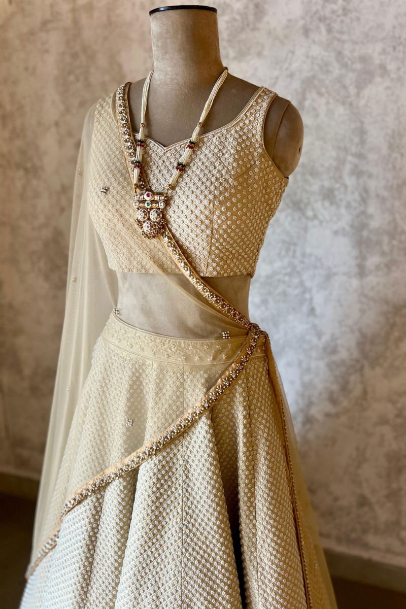 Contents | Pearl hand work on blouse and lehenga with net embroided dupatta |