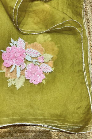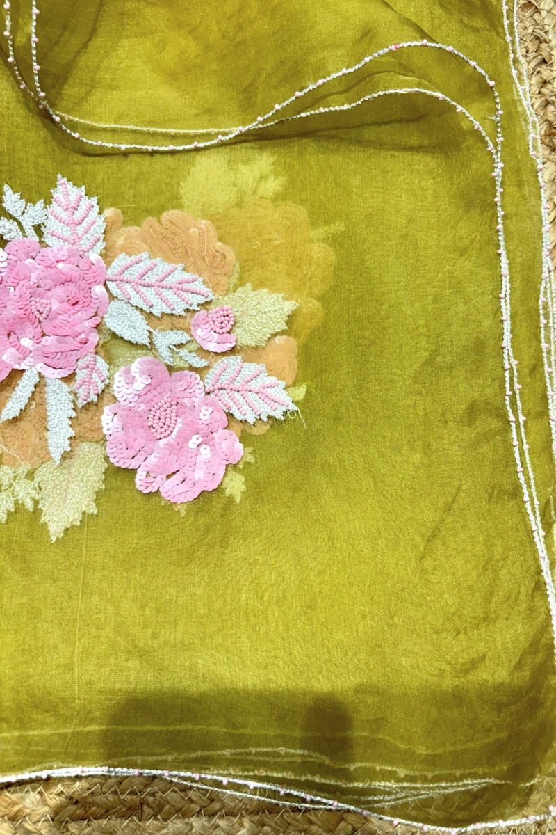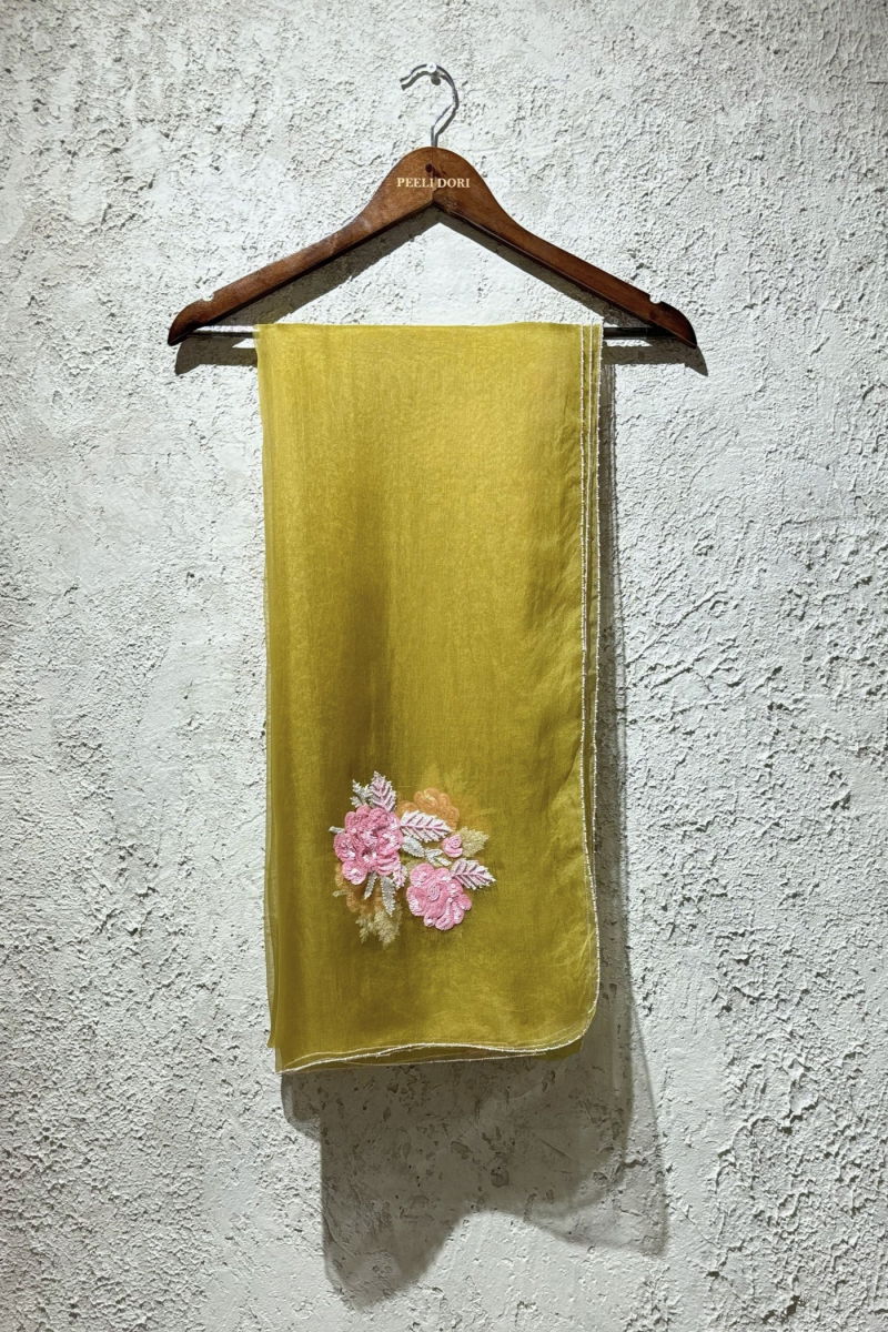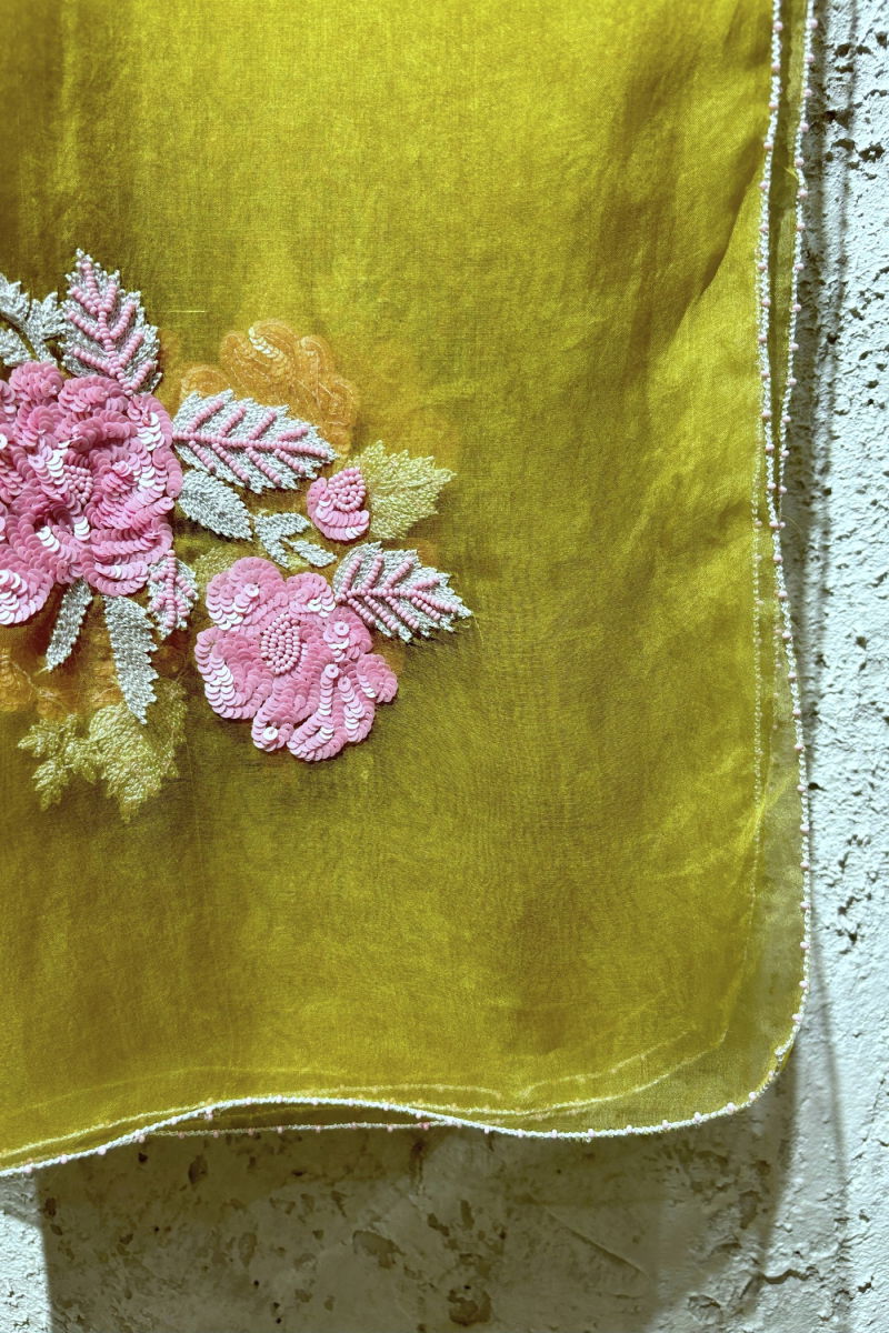 Aaina dupatta is one of the most offbeat colour combinations with details all over. It is 100% hand embroidered with a very modern look to it.