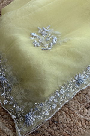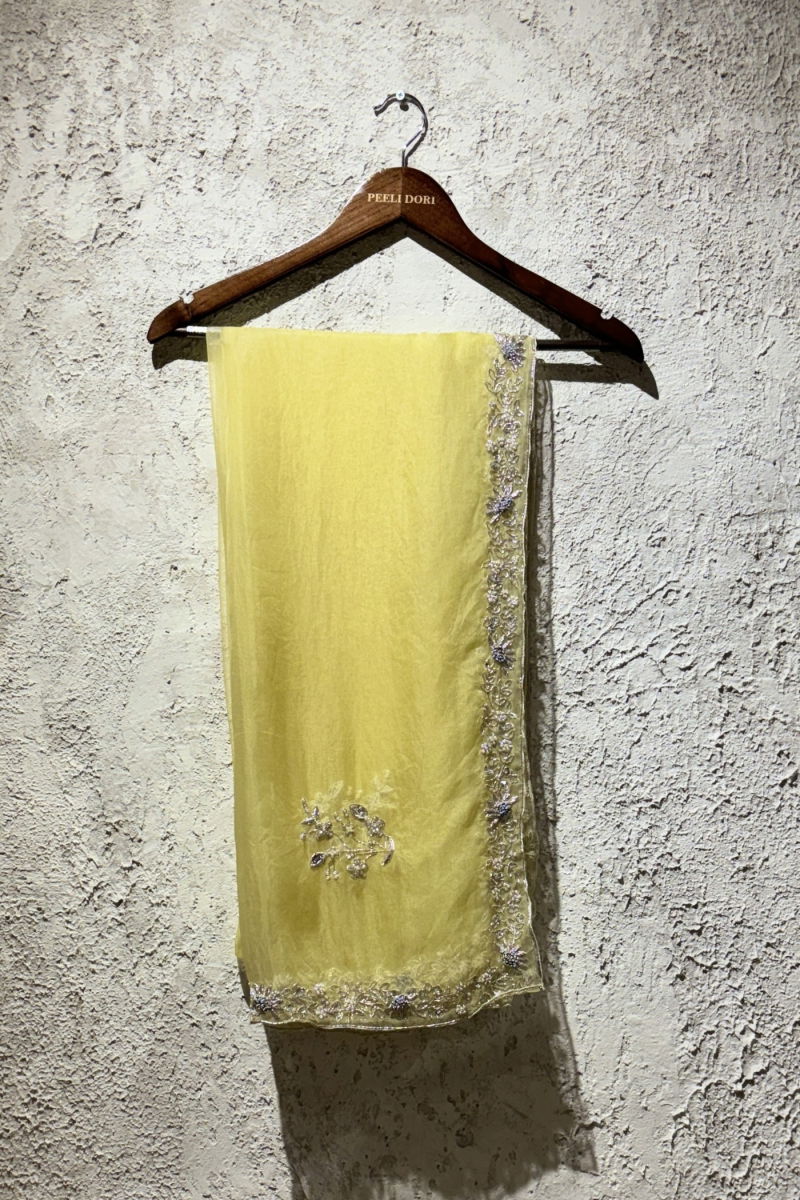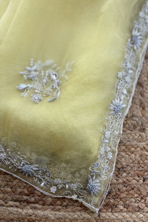 Embracing the richness of cultural heritage and the artistry of skilled hands, the Yellow Meenakshi Dupatta with hand embroidery becomes not just a piece of fabric, but a symbol of timeless beauty and craftsmanship.
