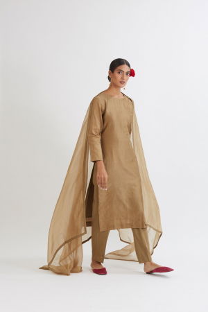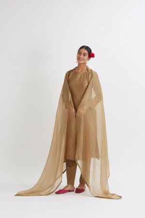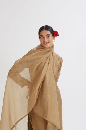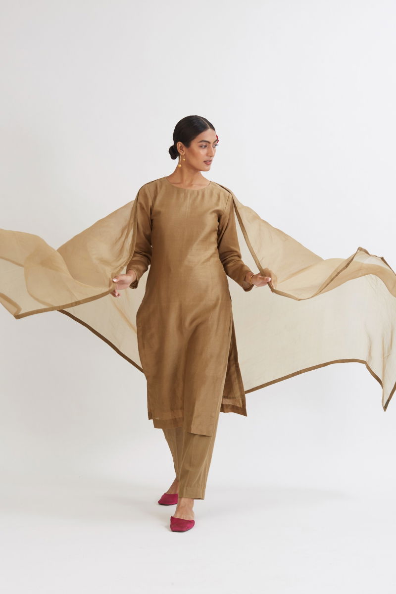 The SUNHERI CHANDERI KURTA SET, part of the Rang collection by Peeli Dori, embodies a harmonious blend of tradition and contemporary elegance. Crafted with a straight-fit chanderi kurta, this set features a culottes-style cotton satin pant, offering a breathable and comfortable fit ideal for extended wear. The ensemble includes a delicate silk organza dupatta, adding a touch of grace and fluidity to the overall look. The chocolate brown hue is achieved through organic dying, ensuring a rich, natural color that reflects artisanal authenticity. Each piece is enhanced with intricate hand-embroidery and textile manipulation techniques, highlighting the craftsmanship rooted in Indian textile traditions. Designed for festive occasions, casual outings, brunches, mehandi ceremonies, and sangeet events, this set strikes a balance between simplicity and festive charm. As a Peeli Dori classic, it stands as a testament to timeless style, combining lightweight chanderi fabric with refined detailing for a fresh, youthful aesthetic.