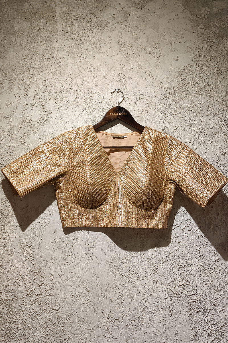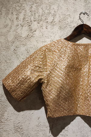 Exude grace and sophistication with this exquisite choli-cut blouse, meticulously crafted from luxurious raw silk. The harmonious blend of shimmering sequins and intricate gota work enhances its allure, creating a stunning fusion of tradition and contemporary charm. Perfect for any occasion, this blouse embodies elegance and style, ensuring you stand out effortlessly.