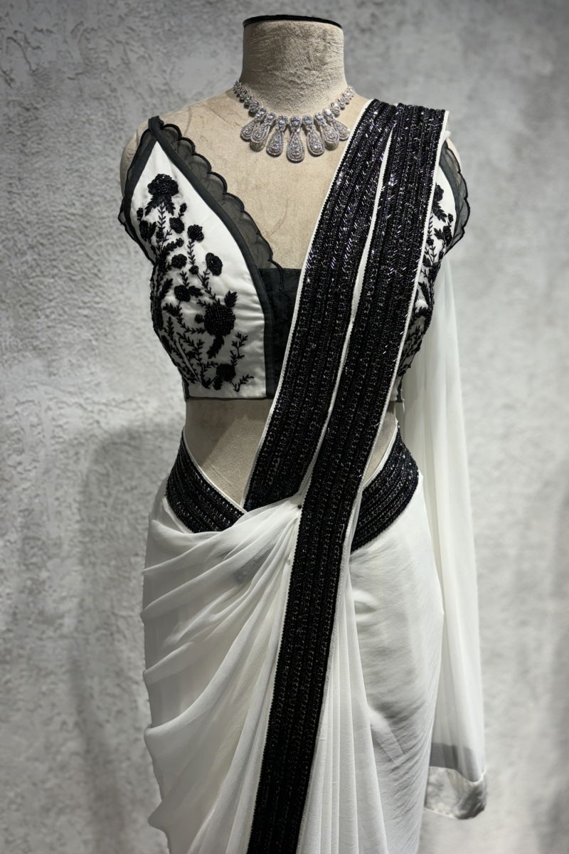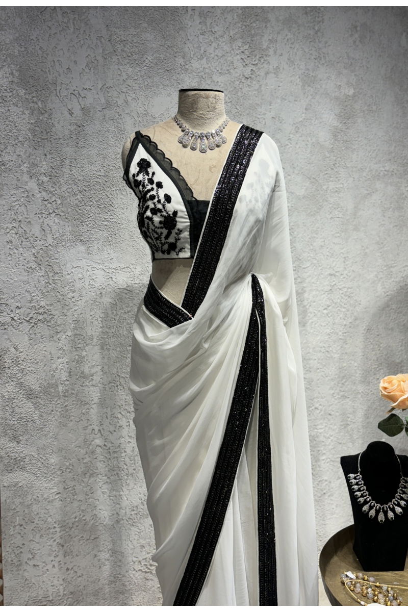 White Anamika Georgette Saree, Georgette Saree, White Saree, Designer Saree, Luxury Fashion, Elegant Drape, Party Wear, Wedding Saree, Festive Attire, Ethnic Fashion, Traditional Wear, Timeless Beauty, Sophisticated Look, Graceful Drape, Lightweight Saree, Women's Apparel, Online Fashion Store, Luxury Clothing, Fashion Clothing, Buy Designer Saree.