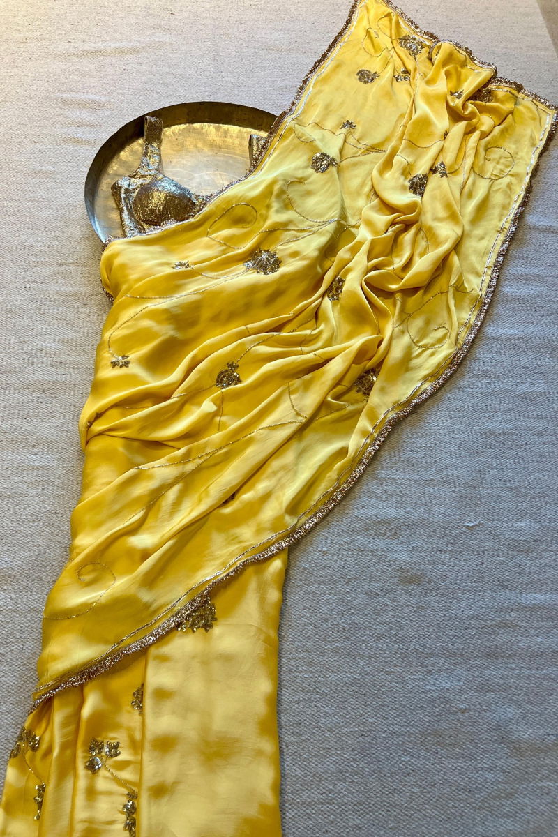 The Siana Saree is a masterpiece of elegance and sophistication, perfect for those seeking a blend of traditional charm and modern allure. This saree is crafted from the finest satin, known for its lightweight and texture that offers a delicate yet structured drape. The yellow hue of the saree exudes a soft, romantic appeal, making it an ideal choice for weddings, receptions, and festive occasions.
